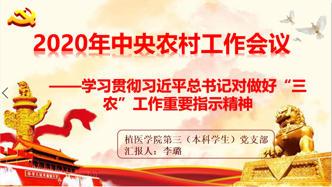 会议由本支部书记丁晨同志主持,植保1703班李璐主讲,借助学习强国平台学习资料,系统地介绍了我们为什么要如此看重解决“三农”问题以及我国围绕解决“三农”问题的工作已经做了哪些,还将要做哪些,以后怎么去做。视频观看结束后,与会党员纷纷说出了自己的想法,马瑞同志有感而发:“作为一名农业大学的大学生党员,所学知识与专业,要为农业农村工作者们提供重要的技术与支持,我们要有深刻的使命意识,增强奉献精神,要立志将田间地头作为舞台,不断获取新的农业知识,加强学习专业知识,不仅限于书本知识,要以实际行动来思考,实践,争做新时代农村工作的坚实力量。”;赵圆秀同志:“身为大学生党员,肩负新时代的使命与重任,我们要紧跟时事,将所学知识积极投入实践,在党的带领下,用青春力量描绘乡村振兴的蓝图。”