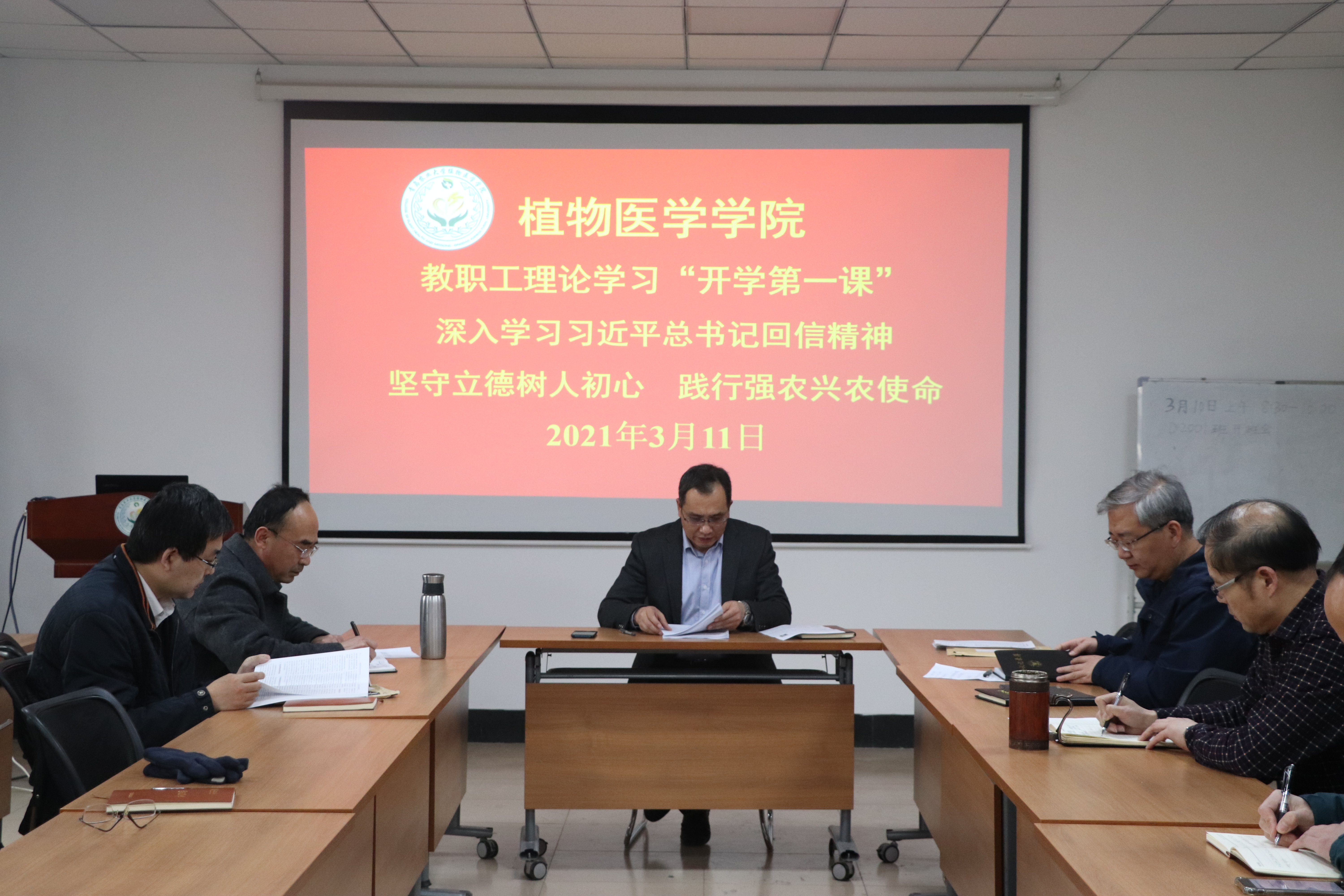 3月11日,tyc7111cc太阳成集团于学院会议室开展2021年春季学期第一次教职工理论学习,学院党总支书记韩强为全体教职工上“开学第一课”,深入学习习近平总书记给全国涉农高校书记校长和专家代表回信精神与习近平总书记关于“三农”工作的重要论述。学院党总支副书记、副院长李军,副院长赵洪海、梁文星、褚栋、黄金光,学院全体教职工参加学习。