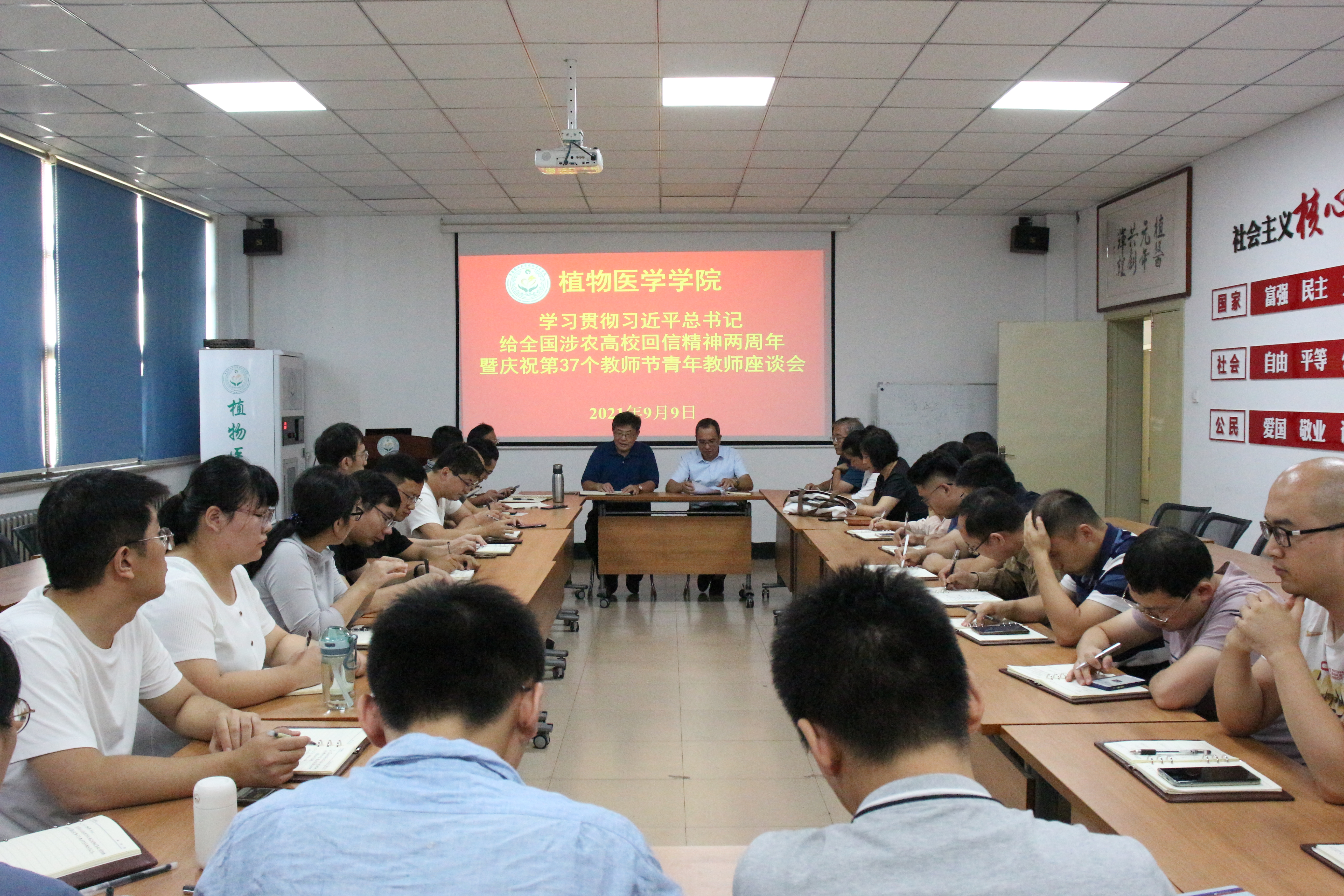 为庆祝第37个教师节,认真学习领会、全面贯彻落实习近平总书记给全国涉农高校回信精神,9月9日,tyc7111cc太阳成集团举行学习贯彻习近平总书记给全国涉农高校回信精神两周年暨庆祝第37个教师节青年教师座谈会。学院院长刘同先,党总支书记韩强,党总支副书记、副院长李军,副院长赵洪海和各教学系主任出席,学院35岁以下青年教师参加,会议由韩强主持。
