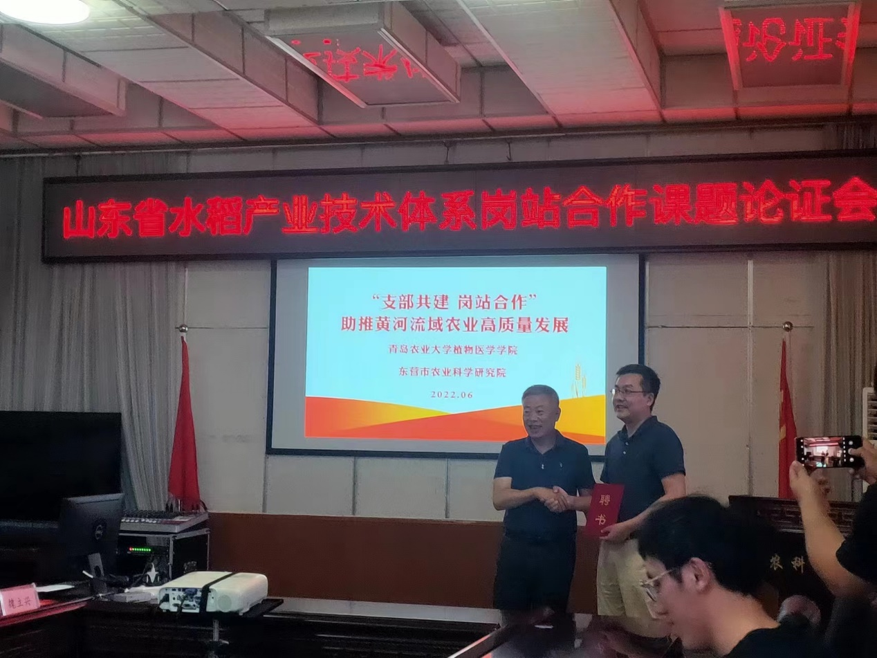 活动中,李树坤代表东营市农科院向褚栋教授颁发特聘专家证书,东营市农科院副研究员魏立兴代表耐盐作物育种与栽培创新团队就东营水稻试验站工作开展情况进行了工作汇报,双方人员围绕黄河流域生态保护和高质量发展、水稻产业区域性病虫害监测和绿色防控等开展了深入座谈和交流论证,并就下一步创新和深化“支部共建、岗站合作”形式,深入服务黄河三角洲农业高质量发展达成了进一步意向。