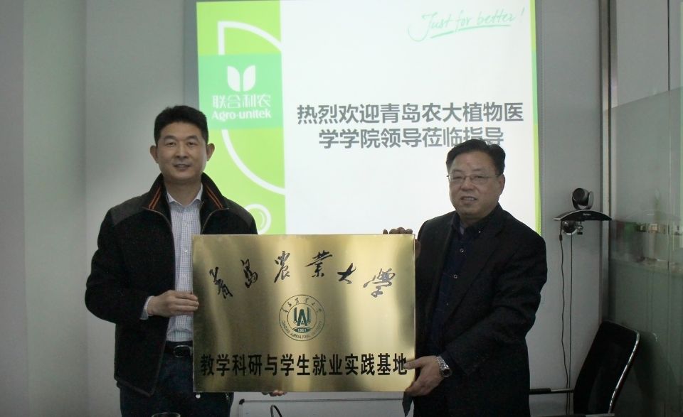 在青岛联合利农进出口有限公司,副总经理姜彦全就公司的发展概况、企业文化、实习生的实习情况等方面做了详细的介绍展示,并对学院2014级实习生踏实肯干的表现给予充分肯定。袁忠林结合植物保护专业发展趋势、办学特色,对双方后续的深度合作提出了殷勤期望。袁忠林与公司总经理冀科庆签署了合作协议书并为教学研究与学生就业实践基地揭牌。