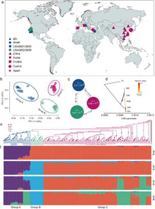 该研究首先组装了烟粉虱MED隐种的高质量染色体水平基因组(图1),进一步比较基因组学分析表明:基因组快速扩张的基因家族和正选择基因除了与杀虫剂相关的多种代谢途径有关以外,还与胰岛素分泌、蜕皮激素分泌、促性腺激素释放及多个信号传导通路等重要生理活动过程相关,这可能与烟粉虱在入侵地的快速适应性进化密切有关。在构建的烟粉虱MED的高质量染色体水平基因组基础上,基于简化基因组测序技术(2b-RAD)对采自原产地地中海地区(克罗地亚、塞浦路斯、西班牙、以色列和波黑)和入侵地区(中国、韩国和美国)的29个不同地理种群样本进行群体基因组学分析,结果表明:烟粉虱MED隐种中美种群具有不同的入侵来源,即亚洲的群体起来源于西地中海国家,而北美的群体则来源于东地中海国家。而且,地中海西部烟粉虱种群也向地中海中/东部地区扩散(图2)。