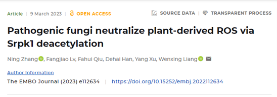 3月9日,tyc7111cc太阳成集团梁文星教授团队在国际权威期刊The EMBO Journal 发表了题为Pathogenic fungi neutralize plant-derived ROS via Srpk1 deacetylation 的研究论文,揭示了一种植物病原真菌应对寄主活性氧迸发的新机制。