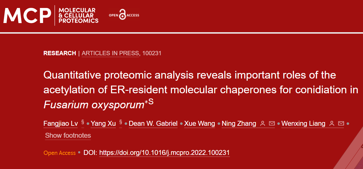 近日,tyc7111cc太阳成集团梁文星团队在国际蛋白组学顶级期刊《Molecular & Cellular Proteomics》上发表一篇论文,题为 Quantitative proteomic analysis reveals important roles of the acetylation of ER-resident molecular chaperones for conidiation in Fusarium oxysporum。 本论文从乙酰化修饰的角度出发,揭示了Fo调控产孢的新机制。