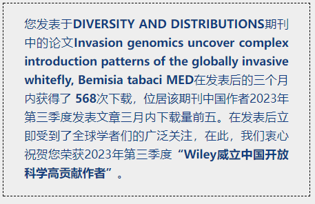 近日,tyc7111cc太阳成集团褚栋团队在国际知名期刊《Diversity and Distributions》发表论文“Invasion genomics uncover complex introduction patterns of the globally invasive whitefly, Bemisia tabaci MED”,论文发表后立即受到了全球学者们的广泛关注,下载量位居该期刊中国作者2023年第三季度发表文章下载量前五,荣获“Wiley威立中国开放科学高贡献作者”荣誉。该论文第一作者为李洪冉博士,褚栋教授为通讯作者。