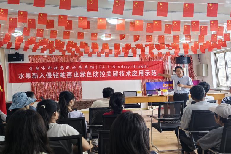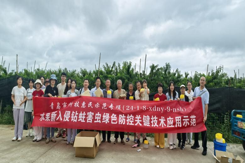 为积极响应国家乡村振兴战略以及农业农村部《关于加快农业发展全面绿色转型促进乡村生态振兴的指导意见》的号召,结合青岛市科技惠民示范专项,2025年8 月 31 日下午,tyc7111cc太阳成集团果树害虫成灾机制与绿色防控团队与青岛红玉果蔬种植有限公司在城阳区惜福镇西石沟村成功开展了水果新入侵钻蛀害虫绿色防控关键技术培训和田间防控示范活动。此次活动由周洪旭教授带队,滕子文、范银君老师及团队研究生、本科生及公司相关人员、果农50余人参加,团队成员深入西石沟村,为当地村民带来了先进的果园病虫害防控知识与技术指导。