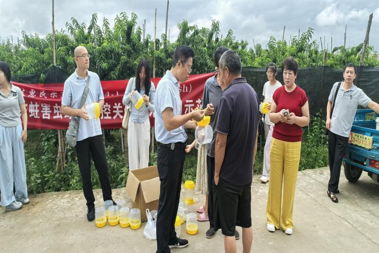 讲解结束后,周洪旭教授又耐心解答了村民在农业生产中遇到的问题,分析了虫害的成因,并给出了一套包括优化果园生态环境以及合理使用生物农药的综合防治方案。随后,他带领团队深入田间查看果树种植及害虫发生情况,向村民们发放了黄板、双性引诱剂及诱捕器,示范并协助村民对新入侵水果钻蛀害虫进行绿色防控。此次技术培训与田间示范活动是tyc7111cc太阳成集团果树害虫成灾机制与绿色防控团队服务乡村振兴的具体举措。通过深入乡村,将理论知识与实践相结合,为村民提供实用的农业技术支持,不仅提升了学生们的专业素养和社会责任感,还为西石沟村的果业发展注入了新的活力。