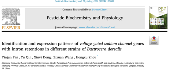 近日,tyc7111cc太阳成集团周洪旭教授团队在国际知名期刊《Pesticide Biochemistry and Physiology》 (中科院一区top,IF=4.7)发表了题为“Identification and expression patterns of voltage-gated sodium channel genes with intron retentions in different strains of Bactrocera dorsalis”的研究论文。该研究首次鉴定了拟除虫菊酯类杀虫剂靶标—钠离子通道的内含子保留转录本,并揭示了其在杀虫剂毒理中的潜在作用,为害虫管理提供了新的视角和思路。