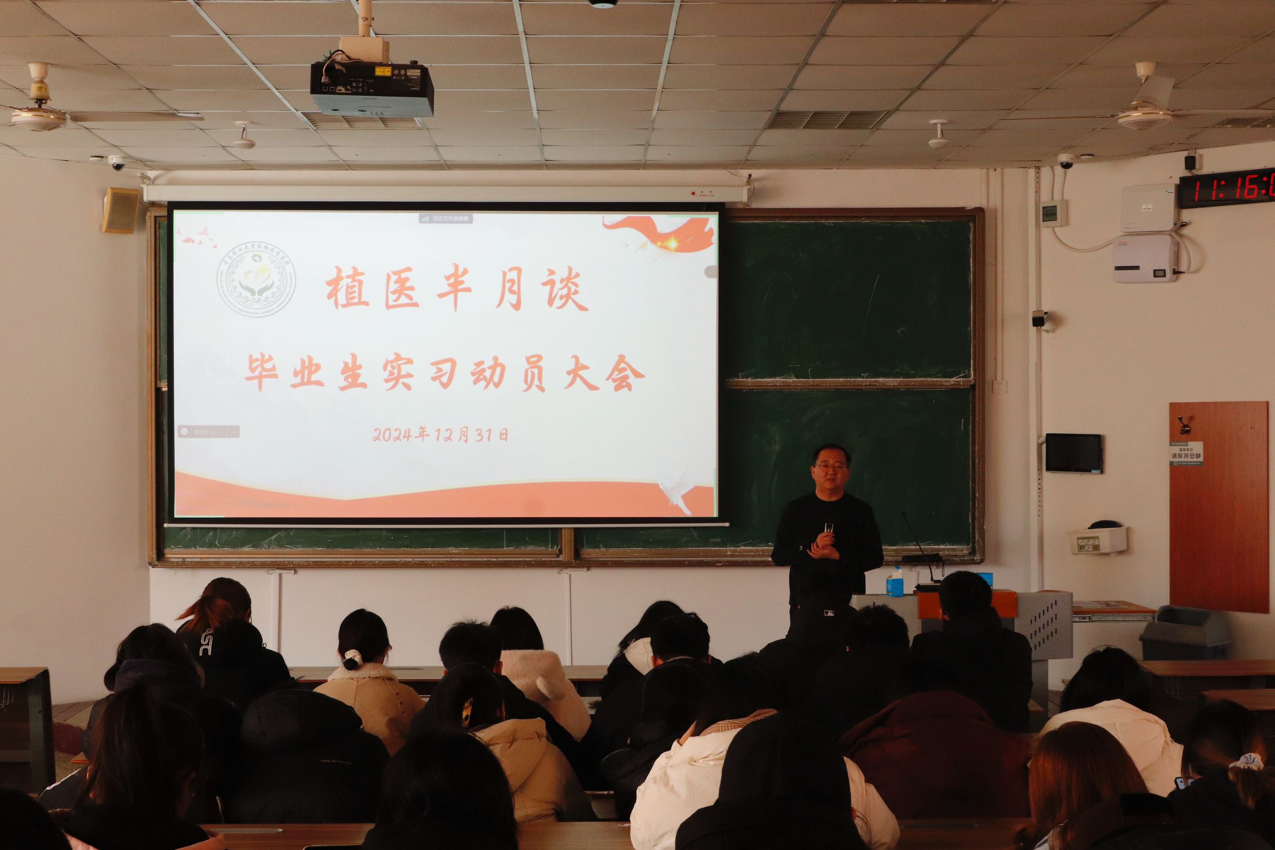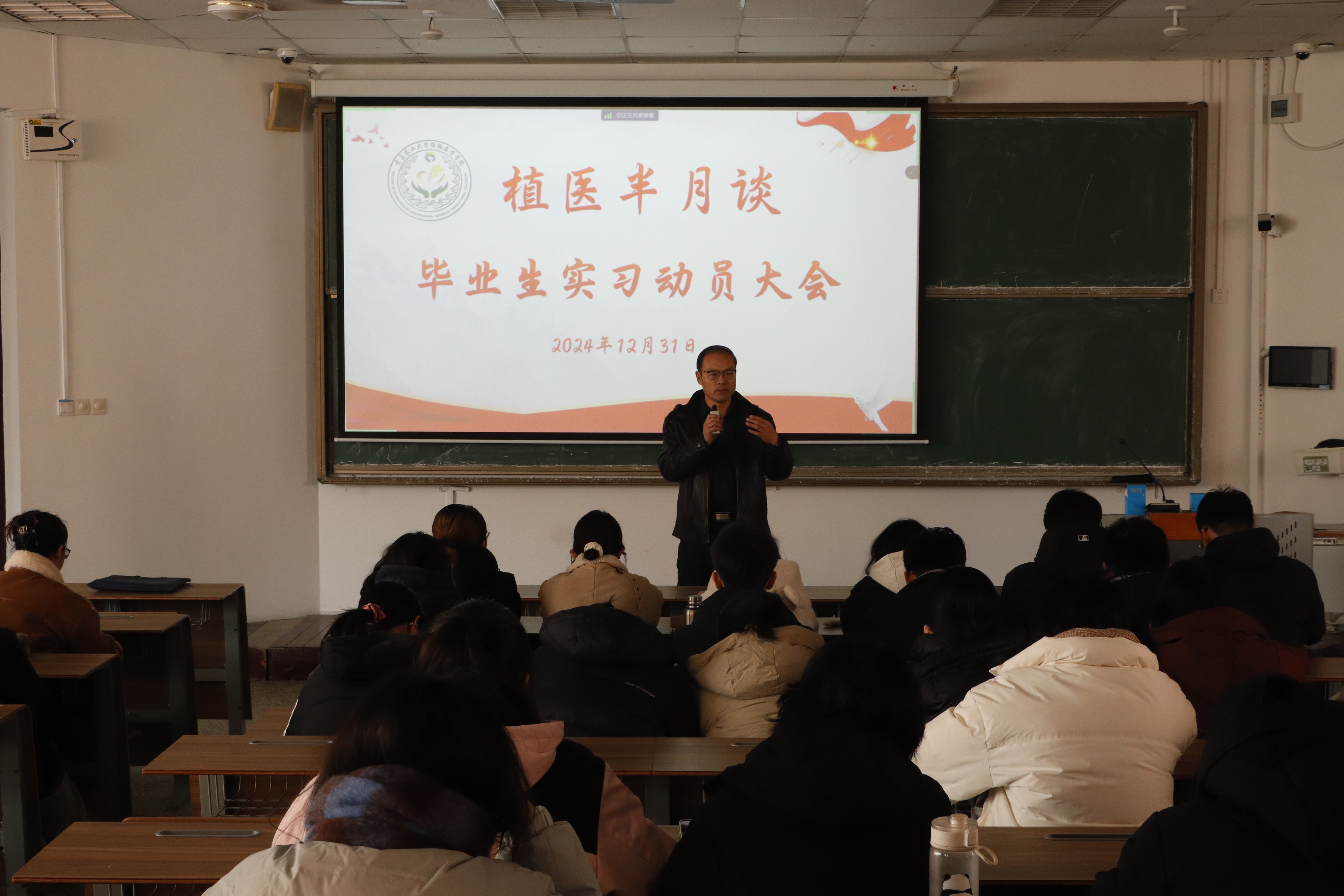 12月31日,tyc7111cc太阳成集团在教学楼B301召开“植医半月谈”——毕业生实习动员暨考研复试指导大会。学院党委副书记、副院长李军,副院长黄金光作考研复试指导和实习动员,青岛海利尔公司代表李圣作就业宣讲。会上,李军针对当前就业形势进行了深入分析,结合2025届硕士研究生报名情况、假期复试准备以及高校调剂政策等为同学们提供考研复试策略及技巧指导,并建议同学们在备考之余也要珍惜实习机会,做好升学和就业的两手准备。