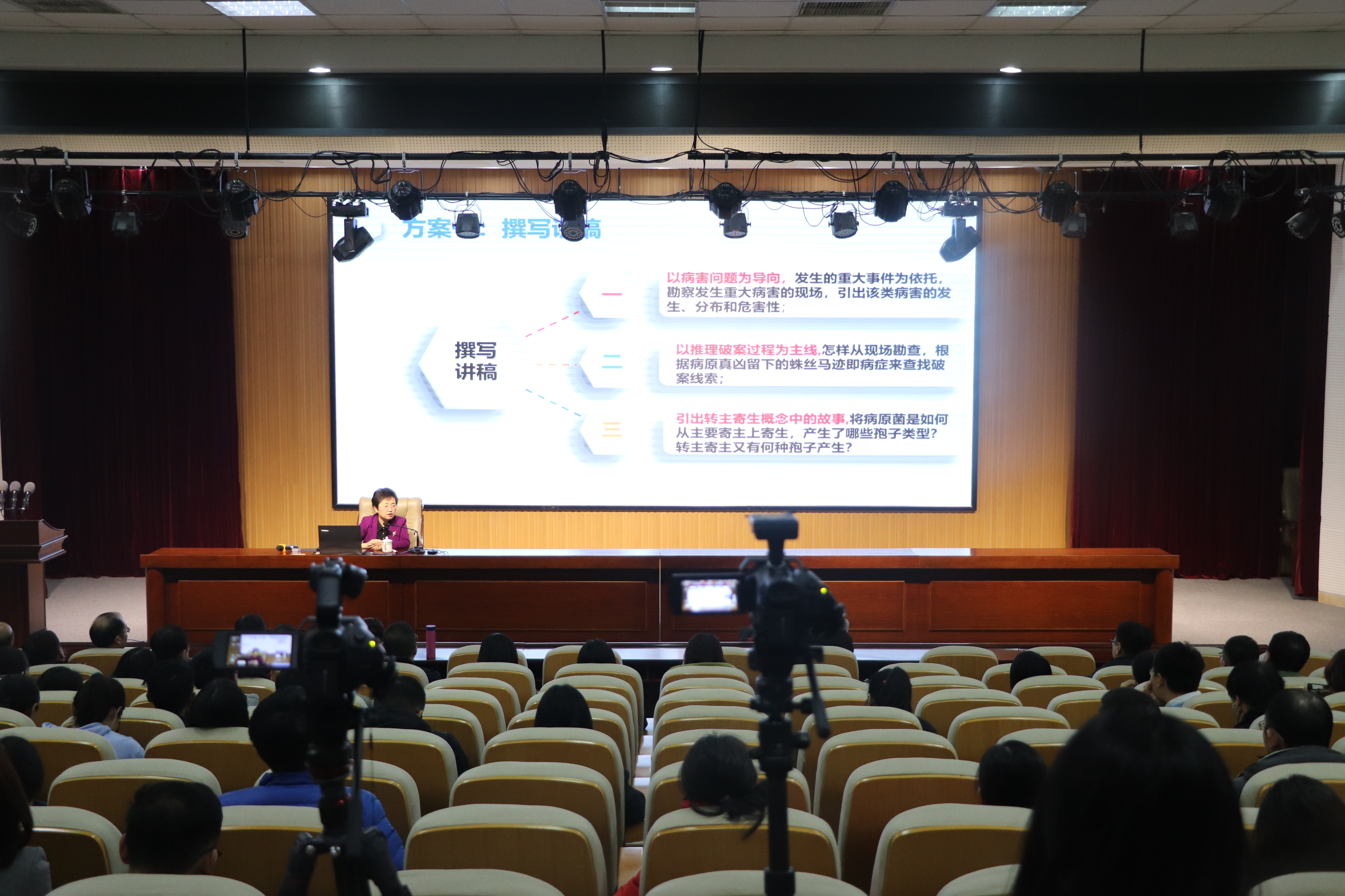 培训会上,徐秉良教授从传统教学、多媒体教学、慕课(MOOC)等发展历程、优缺点引出“金课”,她提出了什么是“金课”、为什么打造“金课”、怎么打造“金课”。强调淘汰低阶性、陈旧性、不用心的“水课”,打造高阶性、创造性、有挑战度的“金课”。她以植物医生诊病指南“金课”为例向大家介绍了打造“金课”的理念与实践,一是思想准备,要求老师们要遵守“师道”,做“四有好老师”,做好教学顶层设计,高度重视课堂教学,以“福尔摩斯探案”的理念编排知识点形成故事逻辑体系;二是教学准备,要求老师建立教学体系,并将教学内容以现场情景还原形式——图片、视频或flash动画,让理论与实践结合,使学生们直观、深刻地理解课堂内容。随后,徐秉良教授进行“金课”的成果展示,并强调课堂教学的生动性和互动性,10分钟的演示效果明显,2019级新生掌握了全部知识要点并回答出徐老师的问题。交流环节,在场教师及学生踊跃发言,提出问题,与徐秉良教授在金课建设、一流课程申报等方面进行了深刻交流。