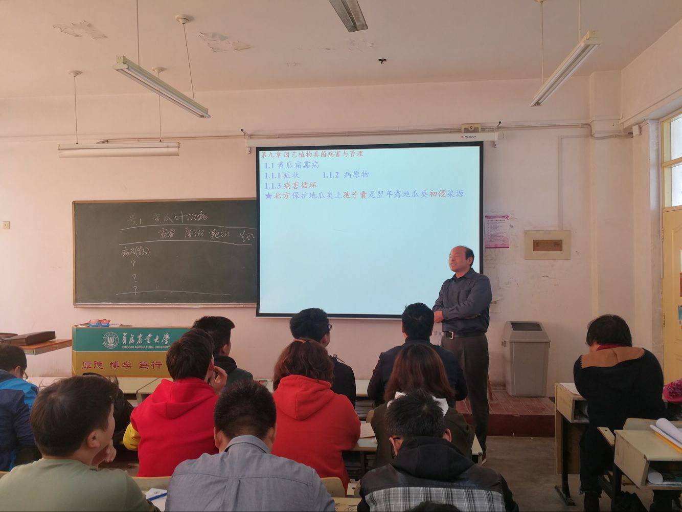 座谈会前,黄金光与老师们一起到教学区F402教室观摩了刘润进教授主讲的园艺植物病理学课程,听课老师们一致认为,刘润进教授在课堂上的教学内容丰富,理论与实践紧密结合,教学课件制作精美,教学方式独特,语言亲切随和,幽默风趣,学生积极主动参与交流。黄金光强调,刘润进教授不仅学问做得好,而且上课上得精彩,深受同学们的好评;他善于总结教学经验,发表过高水平教学研究论文,荣获过各级教学成果奖。他从事教育教学科学研究三十余年,严谨的治学态度、独特的教学方式是值得年轻老师学习的。黄金光希望年轻老师以刘润进教授为榜样,在开展科学研究的同时,将一部分精力投入到教育教学中去,提高自身的教育教学能力,为学院培养出更多的优秀“植物医生”。