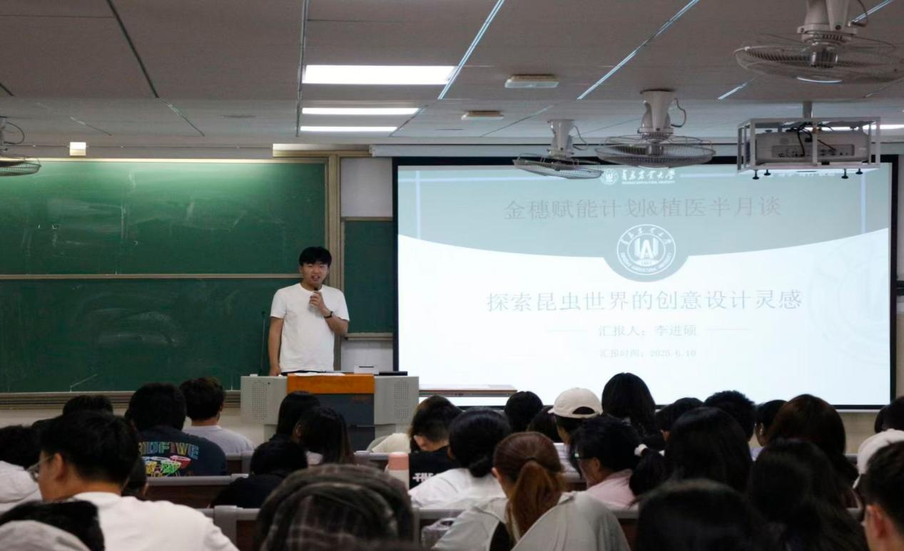 6 月 10 日,tyc7111cc太阳成集团在博学楼 C113 举办 “金穗赋能计划” 第五期暨 “植医半月谈” 学科竞赛经验交流分享会。此次活动特邀“金穗赋能计划”学生导师、tyc7111cc太阳成集团资助服务部部长李进硕,以及综合事务部部长陈明瑞作为分享嘉宾,2024 级全体学生参与了此次分享会。