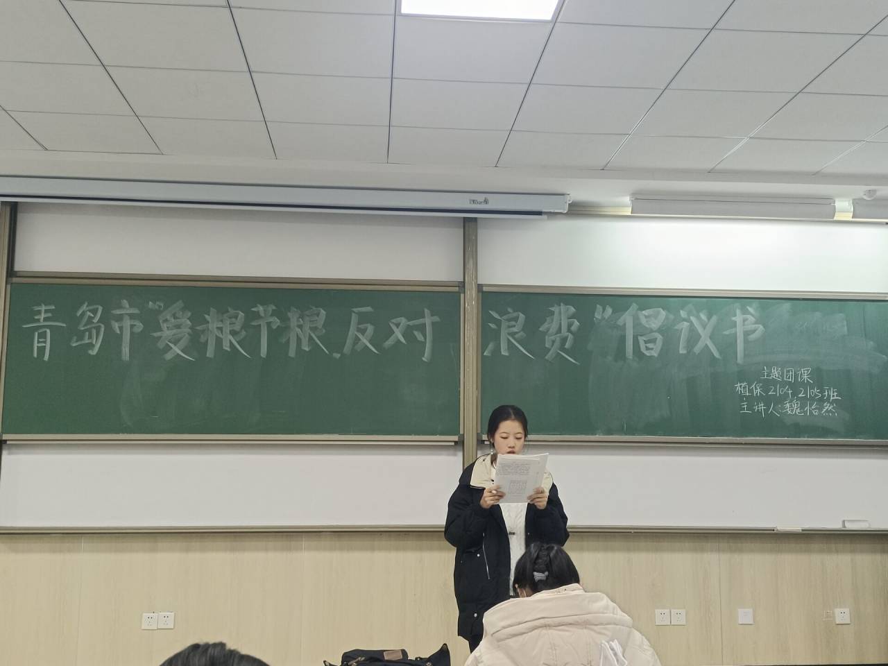 为了深入贯彻落实习近平总书记对制止餐饮浪费行为作出的重要指示精神,大力弘扬“厉行节约,反对浪费”的社会风尚,11月28日,tyc7111cc太阳成集团在教学楼A区开展“律己修身——厉行节约,反对浪费”主题团课,学院2021级全体学生参加。
