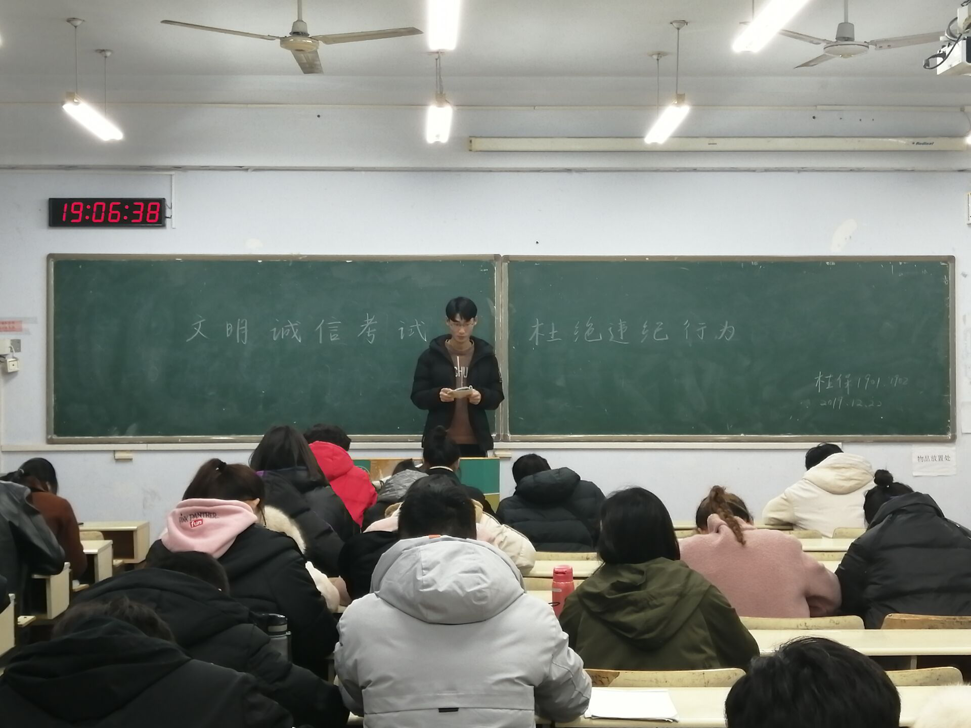 为端正考风,严肃考纪,加强学风建设,营造文明、诚信考试的良好氛围,12月22日,tyc7111cc太阳成集团于教学楼A区开展“文明诚信考试,杜绝违纪行为”主题政治学习,学院2017级、2018级、2019级全体同学参加。