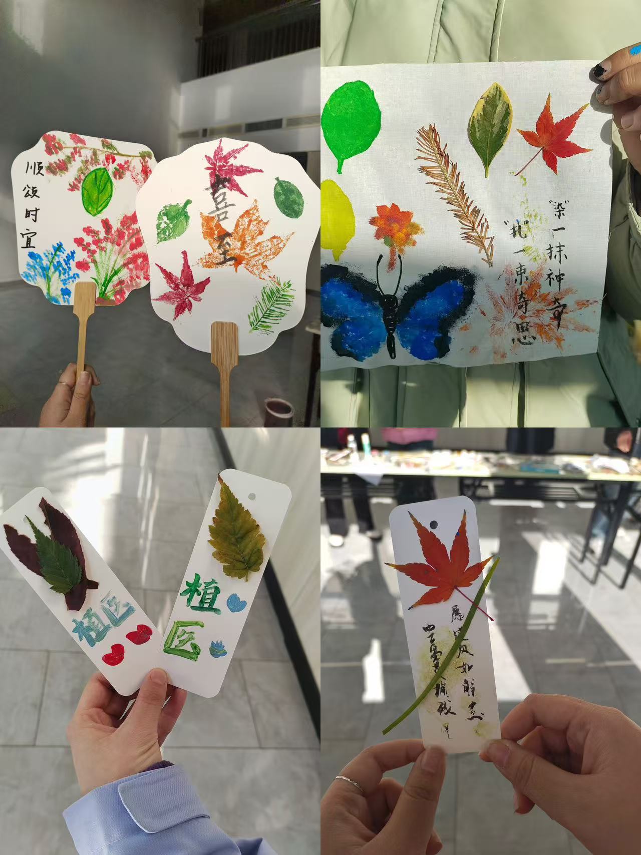 植物拓染活动包含创新拓染作品、创作秋叶诗词、创意绘画书写等流程环节。在制作拓染作品过程中,同学们利用花、草、茎、叶等植物材料,通过敲击使其汁液渗入织物、纸张中,从而将植物的色彩和形状转印到织物、纸张上。同时,他们还通过染料涂抹的方式保存植物的形状。结合秋日美景,同学们还开展了古诗才艺比拼,创作了一幅幅描绘秋日景象的艺术作品。