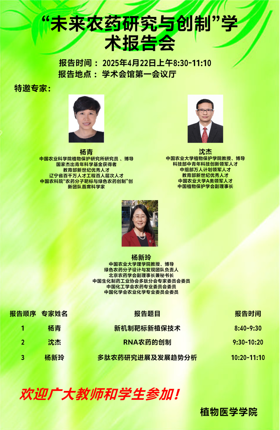 杨青,中国农业科学院植物保护研究所研究员、博导,国家杰出青年基金获得者,中国农科院“农药分子靶标与绿色农药创制”创新团队首席科学家。曾入选教育部“新世纪优秀人才支持计划”、辽宁省百千万人才工程百人层次。长期从事几丁质相关的生物学机制研究,是农药分子靶标研究的开创者之一。几丁质不存在于人畜和植物中,却是害虫和病原菌生长发育不可或缺的生物多糖,因而是高效、安全的绿色农药靶向所在。杨青教授突破传统的“先有农药再发现靶标”研究模式,开创了“生物学机制-靶标发现”新研究范式,发现了一系列安全新高、成药性强的新型分子靶标。部分靶标已经应用于新机制农药的开发。这些研究成果为解决农药的安全性与抗药性问题做出了重要贡献。相关成果以通讯作者身份发表在Nature、Cell、Nature Microbiology、Nature Communications等期刊上。
