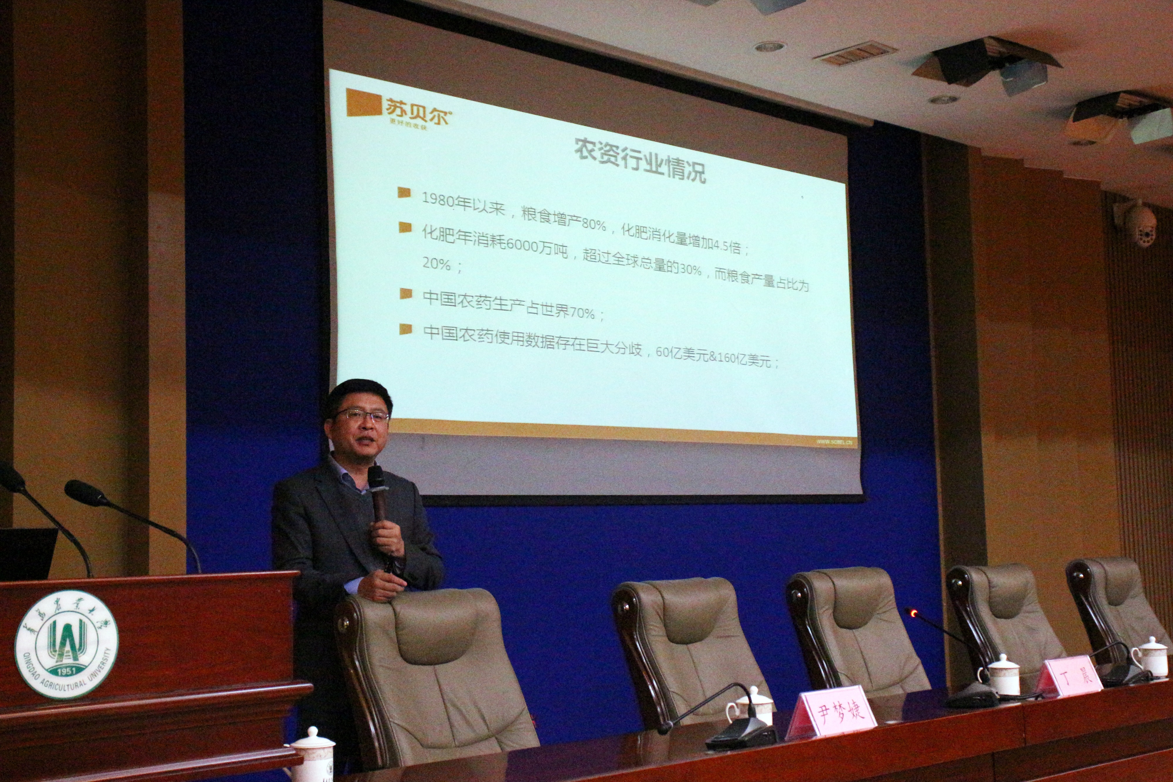 会上,张焕军作了题为《加强行业理解,打造行业竞争力》的主题报告,首先,张焕军通过提出“企业需求什么样的人才”问题、微信图标“为何是人和月球表面”原因及“思考比了解更有意思,但都比不上观察”的观点论证,对当今农业企业发展理念、发展方向、管理措施、营销方式进行了分析阐述。同时,张焕军根据中国粮食进口数量、人均耕地面积、土壤质地分布情况、土地污染及不适应地区开垦等方面对农资行业做了情况分析,并倡导广大农科学子积极投身实践,锻炼自我、磨练意志、提高眼界、学习知识。面对当今中国的农业发展正处于稳步发展的新态势,张焕军对企业及个人发展提出了四点建议,一是技术服务,技术服务是行业的核心和灵魂。提升能力素质是学生走上工作岗位的先决条件。能力素质包括营销能力、管理能力、专业能力及核心能力。第二是系统的学习,深刻理解并应用理论知识,对于企业创新科研及文化品牌凝练具有重要意义,这也是企业针对高素质人才招聘的根本原因。三是自我管理能力,要始终做到情绪管理、生活管理,严格要求自身,客观地去看待事件。四是要努力做到王阳明知行合一,格物致知的精神理念。