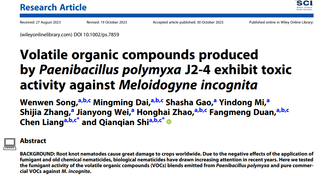 近日,tyc7111cc太阳成集团赵洪海教授团队在《Pest Management Science》在线发表了“Volatile organic compounds produced by Paenibacillus polymyxa J2-4 exhibit toxic activity against Meloidogyne incognita” 的研究论文。该论文明确了多粘类芽孢杆菌J2-4的挥发性有机化合物具有潜在的防控根结线虫的应用价值,为新型绿色防控产品的研发创制提供了天然产物的结构基础。