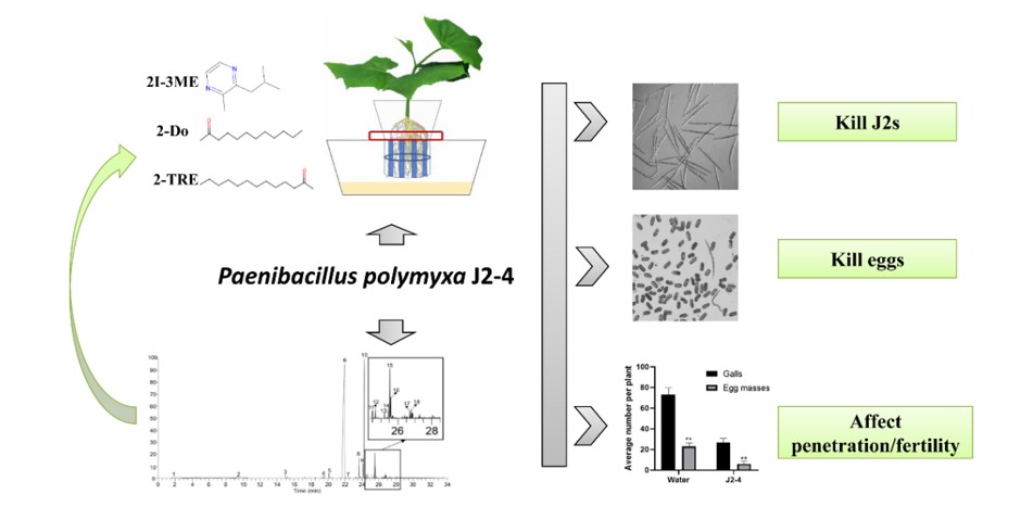多粘类芽孢杆菌J2-4是由本实验室分离得到的一株生防细菌,前期研究发现其对南方根结线虫的2龄幼虫(J2s)具有较高的毒杀活性,盆栽试验证实其具有较高的防效,并探明了其抗性诱导作用及相关机制(Phyopathology, 2023)。在此基础上,本研究首先明确了菌株J2-4的VOCs对南方根结线虫的J2s具有高毒性,对卵孵化也有明显的抑制作用;其次,旨在评价菌株J2-4产生的VOCs对南方根结线虫防效的3层盆栽试验结果表明,经过P. polymyxa J2-4的VOCs处理后,黄瓜上产生的根结和卵块数量显著减少,分别减少了63.38%和73.26%;进一步采用气相色谱-质谱法鉴定了该菌株的14种VOCs,其中,5种VOCs对J2s具有较高的体外杀线虫活性;最后的温室试验表明,2-异丁基-3-甲基吡嗪(2I-3ME)、2-十二酮(2-DO)和2-十三酮(2-TRE)能够显著减少根结和卵块数量,且经2I-3ME处理的与经阿维菌素处理的卵块数量无显著差异。