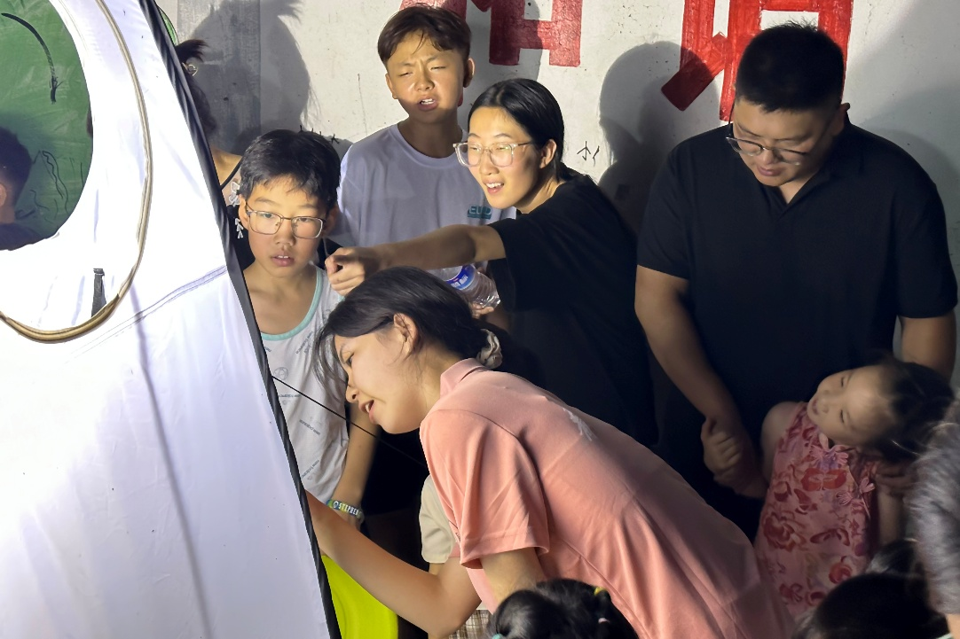 夜幕降临,羊里街道居民广场的灯光诱捕装置成为最吸睛的“科学展台”。团队成员通过现场捕捉昆虫和展示昆虫标本的方式,向居民们普及昆虫知识,生动讲解了昆虫与生态环境之间的关联,在互动体验中强化“科学使用生物农药”的环保意识,让绿色发展理念如星光般照亮乡村夜空。
