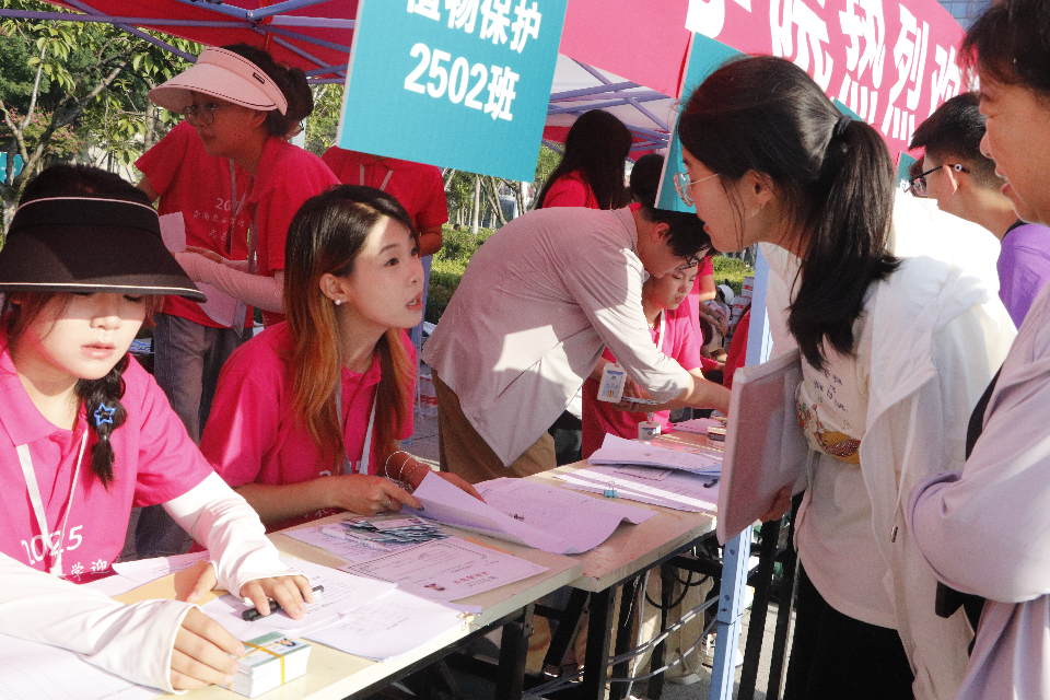 迎新现场,志愿者们以蓬勃的朝气和专业的素养,为新生提供从报到注册到宿舍安置的一站式服务,全程热情细致,让新生们刚入校园就感受到家的温暖。他们有的是连续三年参与迎新的“老兵”,有的是刚接过接力棒的“新人”,但都怀着同样的热忱,带新生参观校园,让新生们对专业学习充满期待。“植物病虫害标本展区”“学院特色拍照立牌”前,志愿者为新生及家长详解专业内涵与行业前景,一个个形态各异的昆虫标本生动展现了植物医学学科的独特魅力。