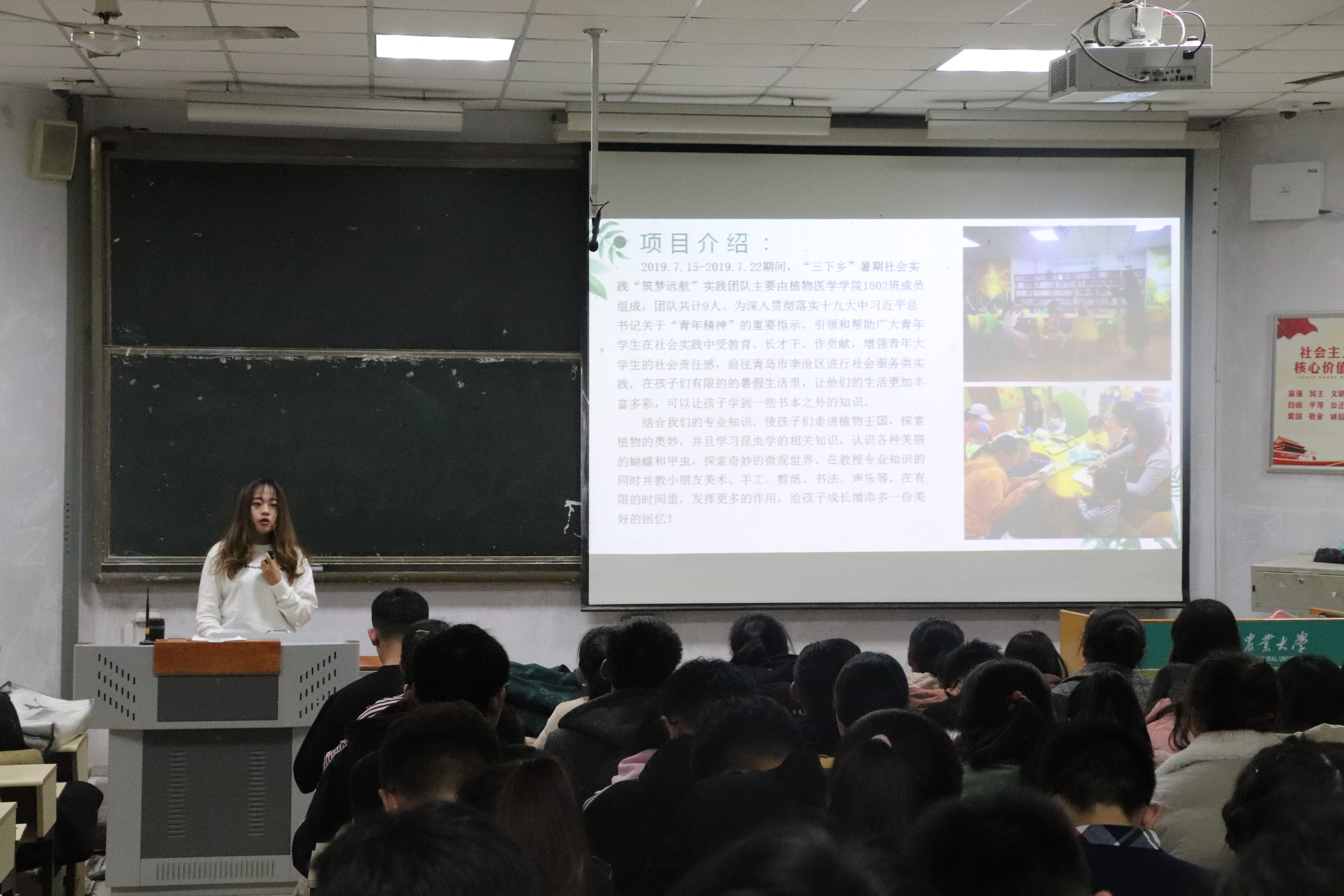 会上,植保D1801班张浩楠、黄衡,植保1802班于智欣分享了她们所在团队支教的前期准备、支教内容、后期宣传等方面的相关经验;植保1801班韩蕊分享了崂山林业有害生物调查的实践经历;植保1701孔令浩分享了作物线虫及其防控市场的实践经历以及团队后期宣传工作的开展过程;植保1804李梦涵介绍了农药使用安全大使的相关工作;植保1802刘晓雨为2019级同学详细讲解了第二课堂相关工作。会上,在场同学踊跃发言,提出了社会实践相关的诸多问题,学长学姐一一耐心解答。