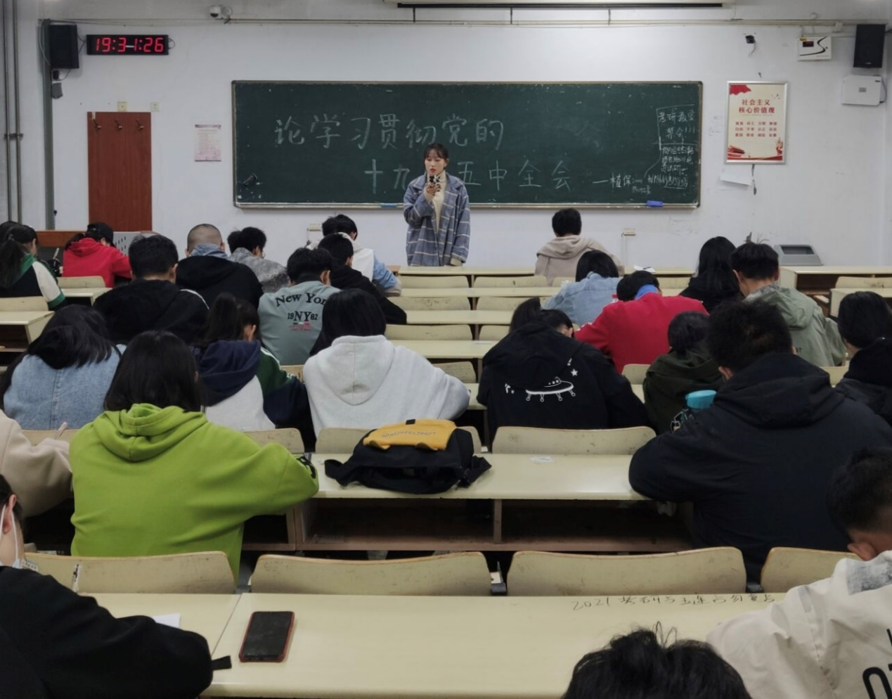 为增强当代大学生对党的十九届五中全会精神的理解,11月1日,tyc7111cc太阳成集团在教学区开展了“学习贯彻党的十九届五中全会精神”主题团课。2018级、2019级、2020级全体同学参加。