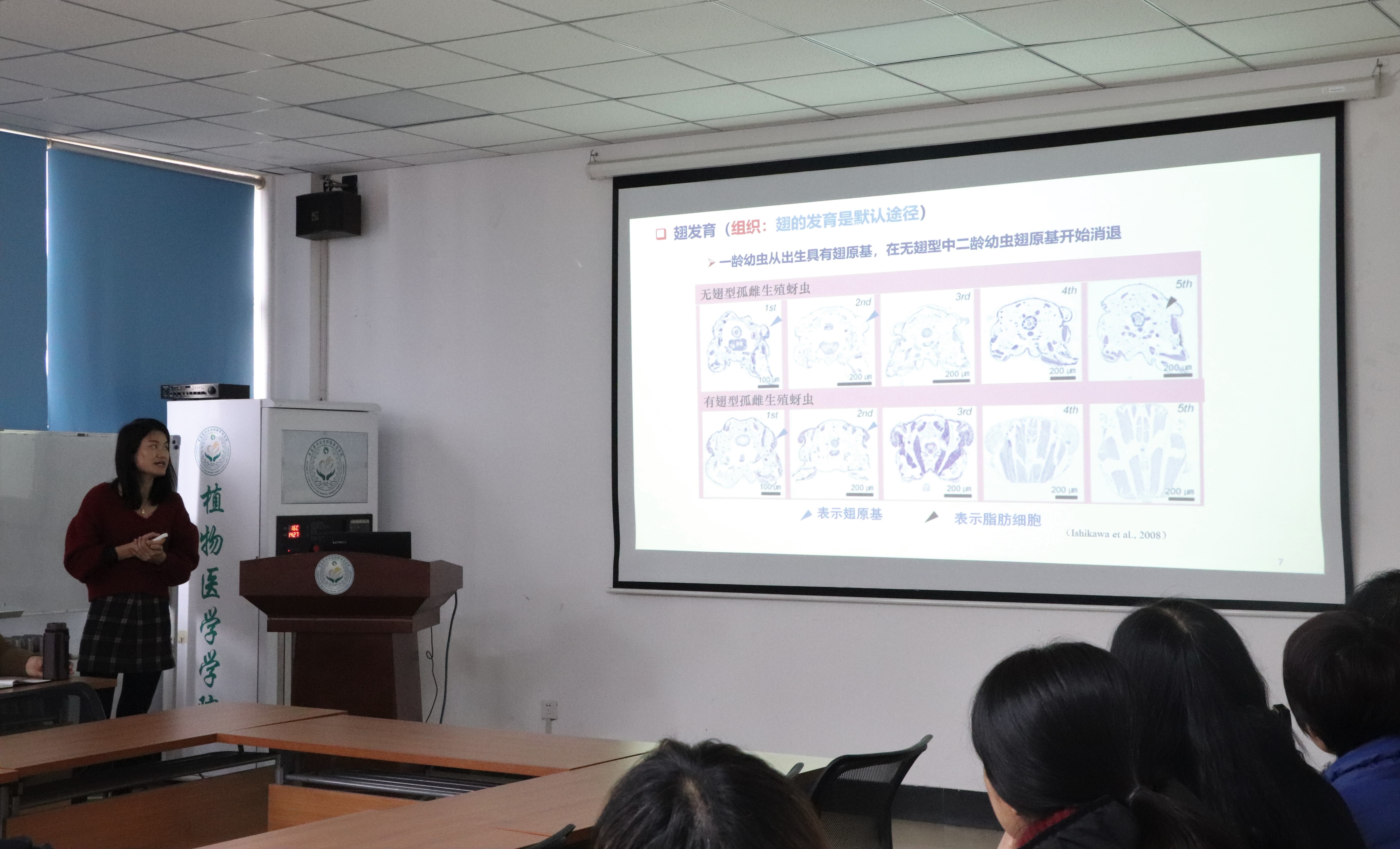 会上,范银君以“禾谷缢管蚜翅型的基因表达”为主题作了汇报。她从研究背景到假设对比判断,详细地介绍了在探究过程中是如何发现何种基因控制翅型的表达、何种机制调控了该基因在蚜虫两翅型中的差异性表达等探究结果并对研究成果进行分析。论坛最后,教师们就“禾谷缢管蚜翅型的基因表达”汇报内容积极地提出问题,共同交流探讨。