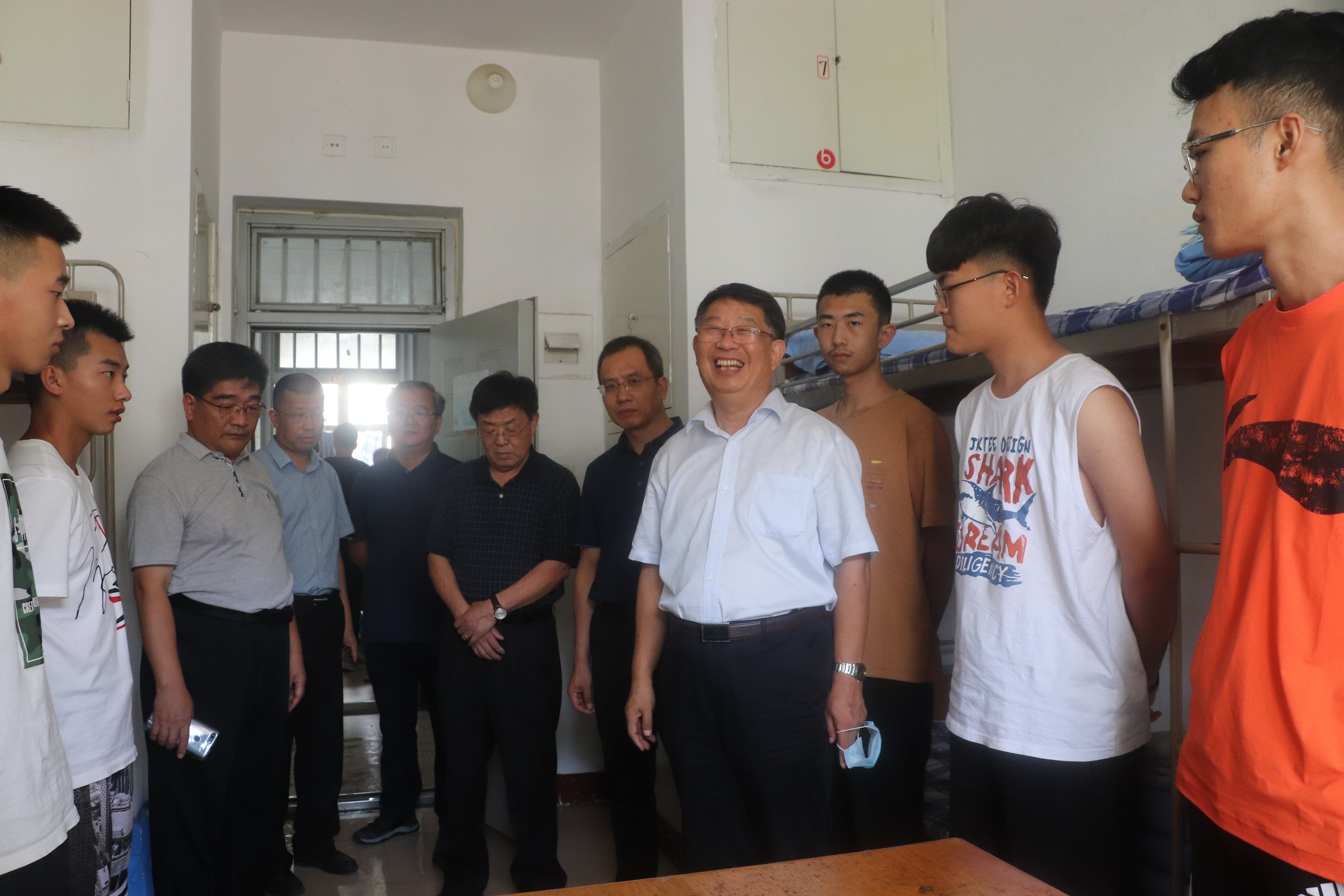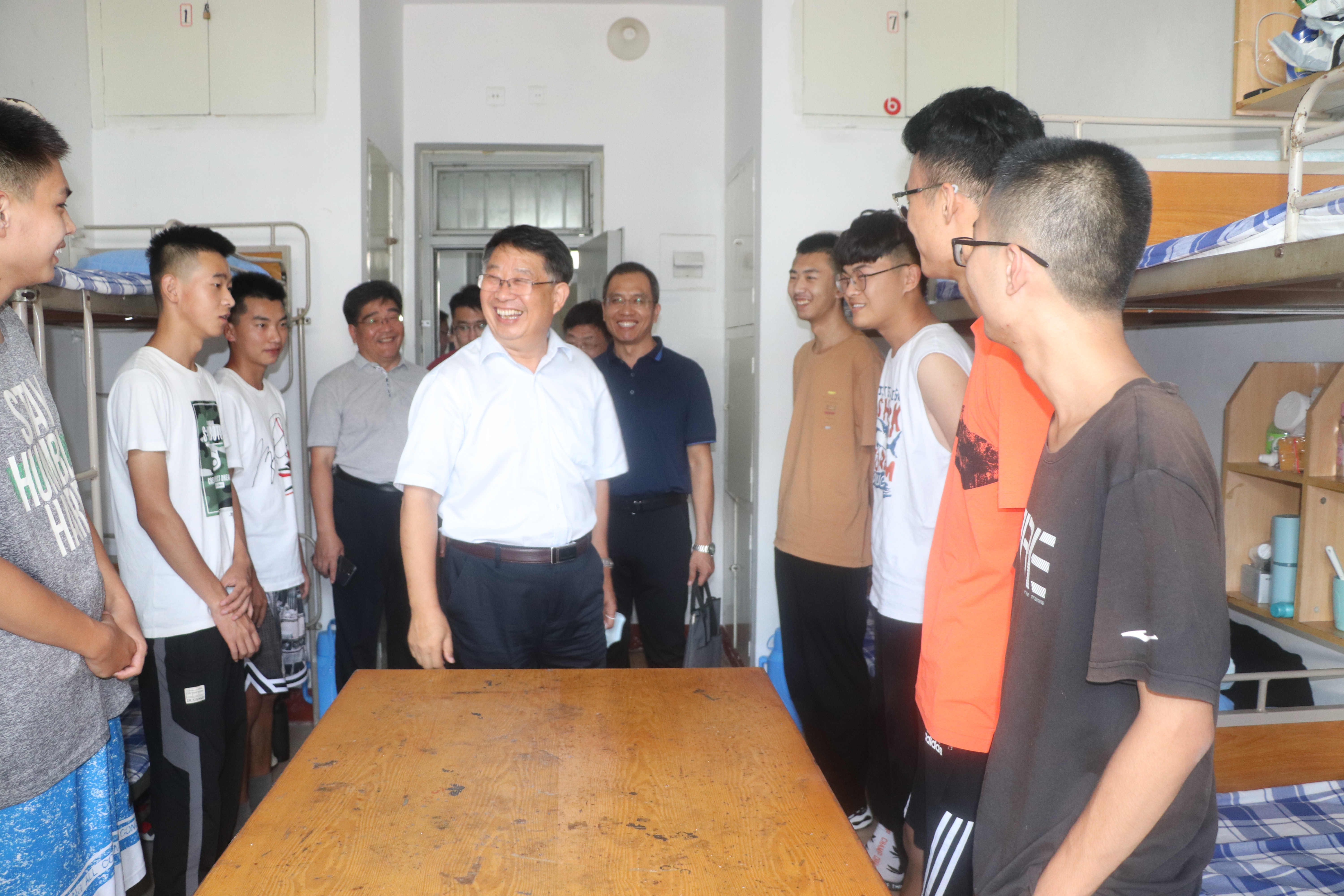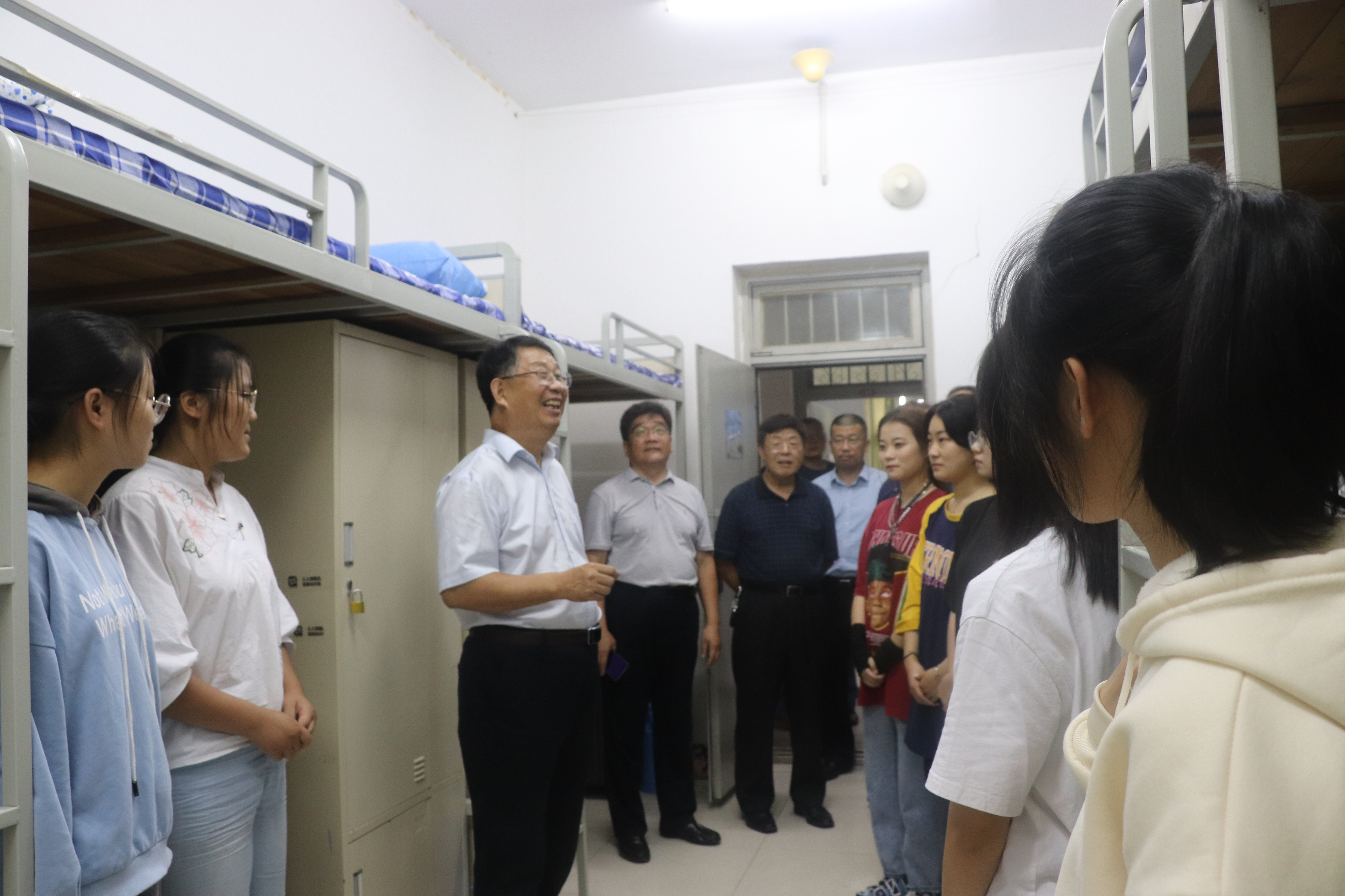 9月13日下午,太阳成tyc7111cc校党委书记李宝笃,党委副书记单连岱,学工部部长王清春前往宿舍区走访慰问tyc7111cc太阳成集团2020级新生,学院党总支书记韩强,院长刘同先等人陪同走访。
