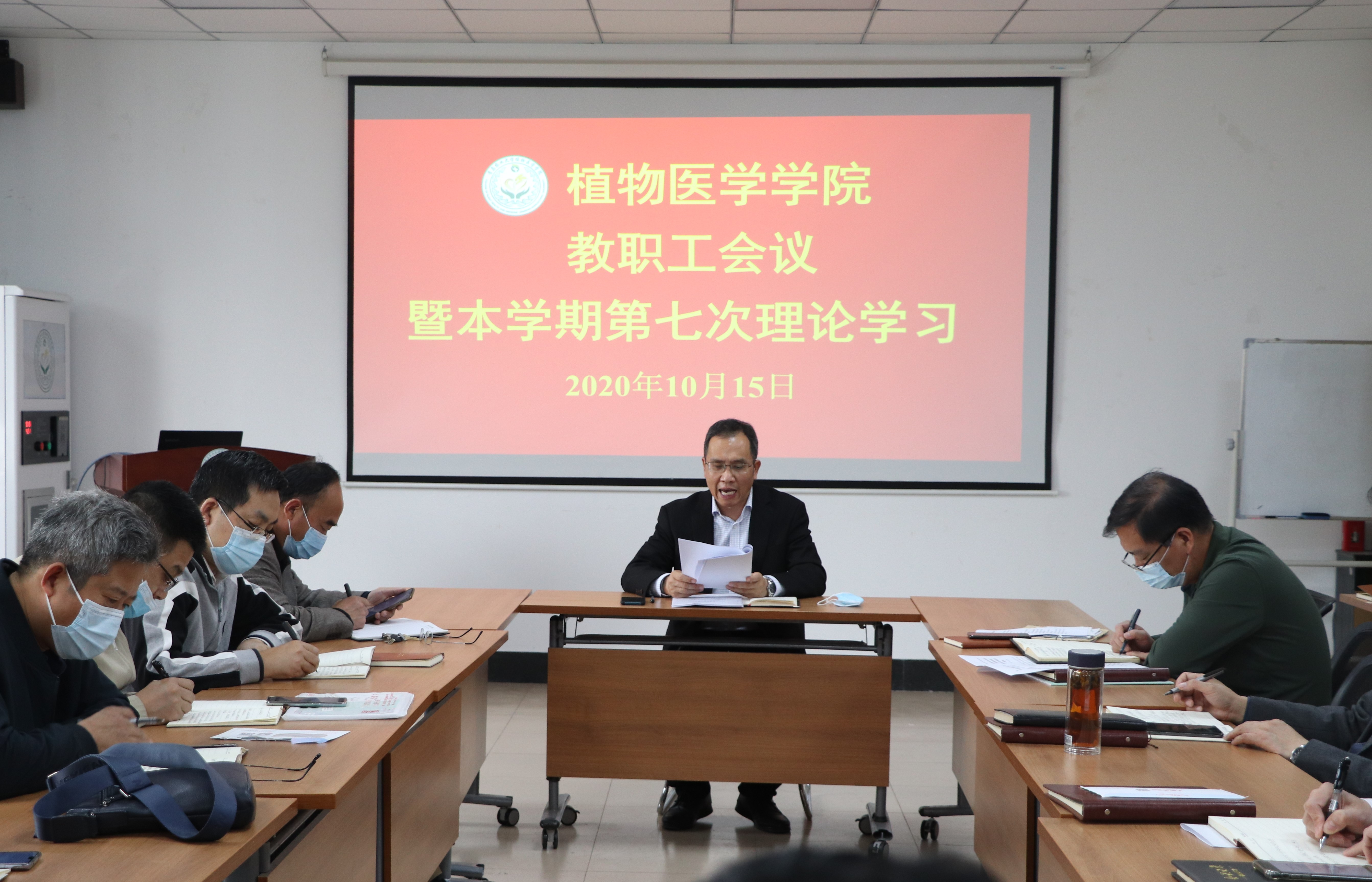 10月15日下午,tyc7111cc太阳成集团在生物楼N406召开全体教职工会议暨本学期第七次教职工理论学习,学院党政领导班子成员和学院全体教职工出席会议,会议由学院党总支书记韩强主持。
