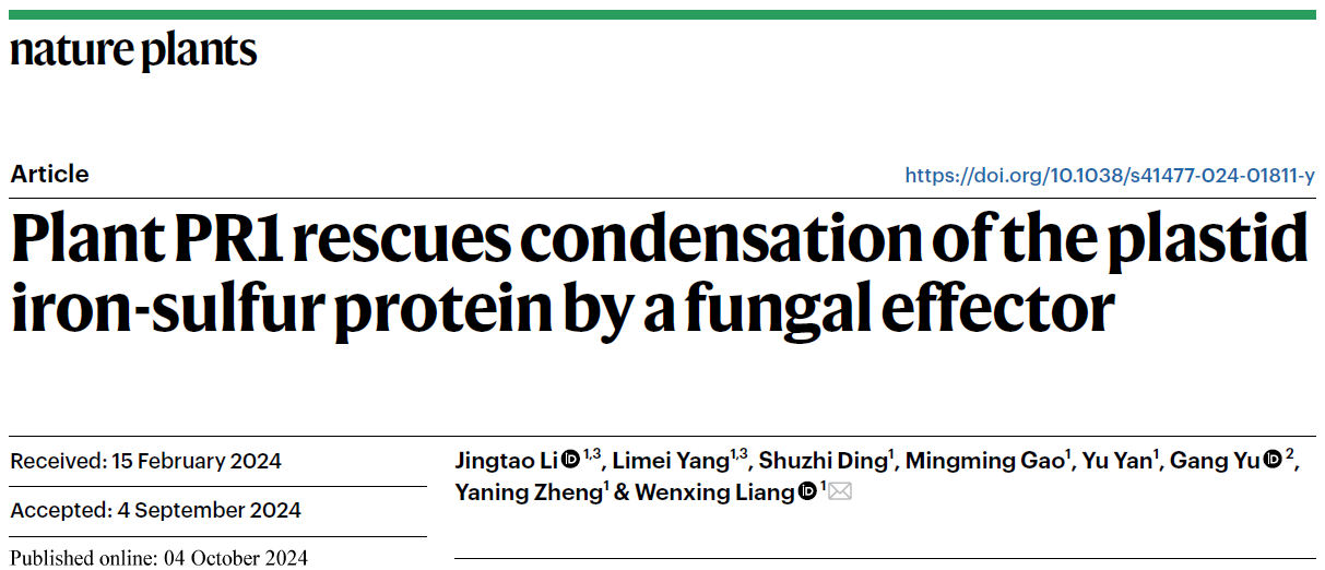 近日,tyc7111cc太阳成集团梁文星教授团队在国际顶级期刊Nature Plants发表了题为“Plant PR1 rescues condensation of the plastid iron-sulfur protein by a fungal effector”的研究论文(论文链接:https://www.nature.com/articles/s41477-024-01811-y),解析了尖孢镰刀菌效应蛋白在寄主胞内通过相分离凝聚铁硫蛋白抑制寄主活性氧产生,然而番茄病程相关蛋白PR1可阻止效应蛋白从质外体进入寄主胞内从而介导抗性的分子机制。tyc7111cc太阳成集团李敬涛副教授为第一作者、硕士研究生杨莉梅为共同第一作者,梁文星教授为唯一通讯作者。