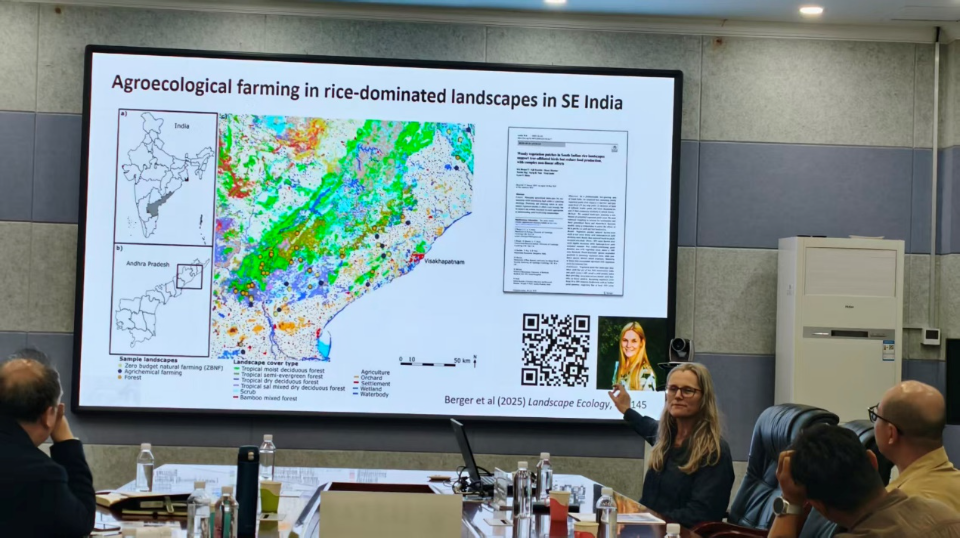 报告中,Dicks教授围绕农业系统在全球生物多样性保护中的核心作用展开系统阐述。她首先点明了农业生态系统既是生物多样性受威胁的主要场景,也同时具备成为生物多样性保护关键载体的双重属性,随后以英国、印度、巴西、智利等多国的田间实验与长期监测数据为支撑,深入剖析了再生农业模式、生态农业等可持续农业实践对提升农田功能生物多样性的影响,同时也客观呈现了部分模式下产量与生物多样性保护之间的权衡关系。此外,Dicks教授还重点分享了其团队在印度东南部农业主产区开展的生态农业研究案例,展示了“零预算自然农业”等模式在复杂农业景观中对生物多样性的提升效果。