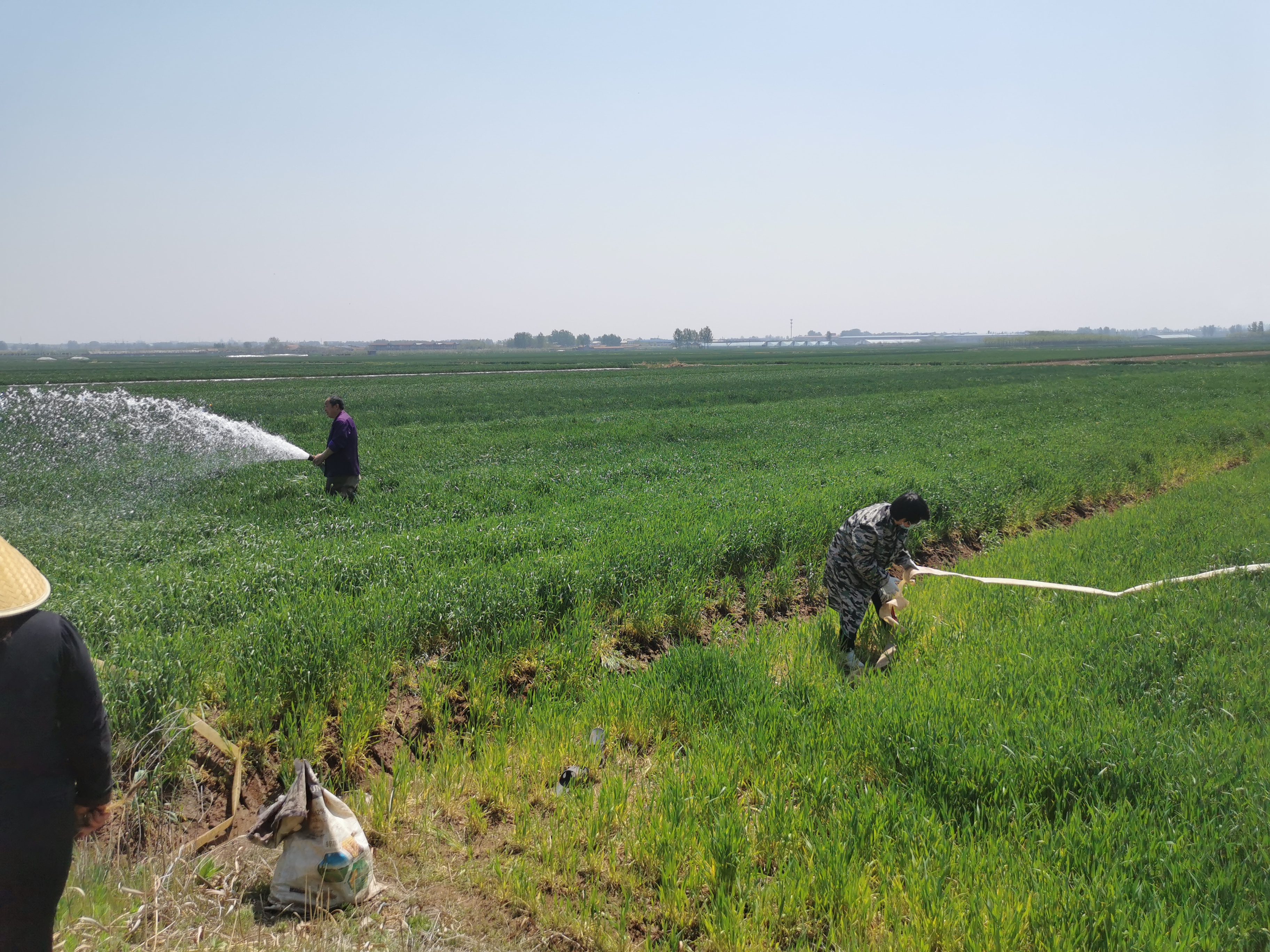 由于今年的气候比较干旱,在小麦生长的重要阶段没有足够的雨水,韩文姣同学开起了自家的拖拉机,搬了12个水管,到池塘抽水帮助农民浇溉小麦田。这段的时间里,韩文姣几乎一直在麦田里没有离开过,有时候她疲倦地直接坐到了地上,休息一会儿便接着干,由于干燥的天气加上炎炎烈日,皮肤也晒黑了。同时她还建议农民们不要使用漫灌,而是选用滴管和喷灌的方式进行科学灌溉。