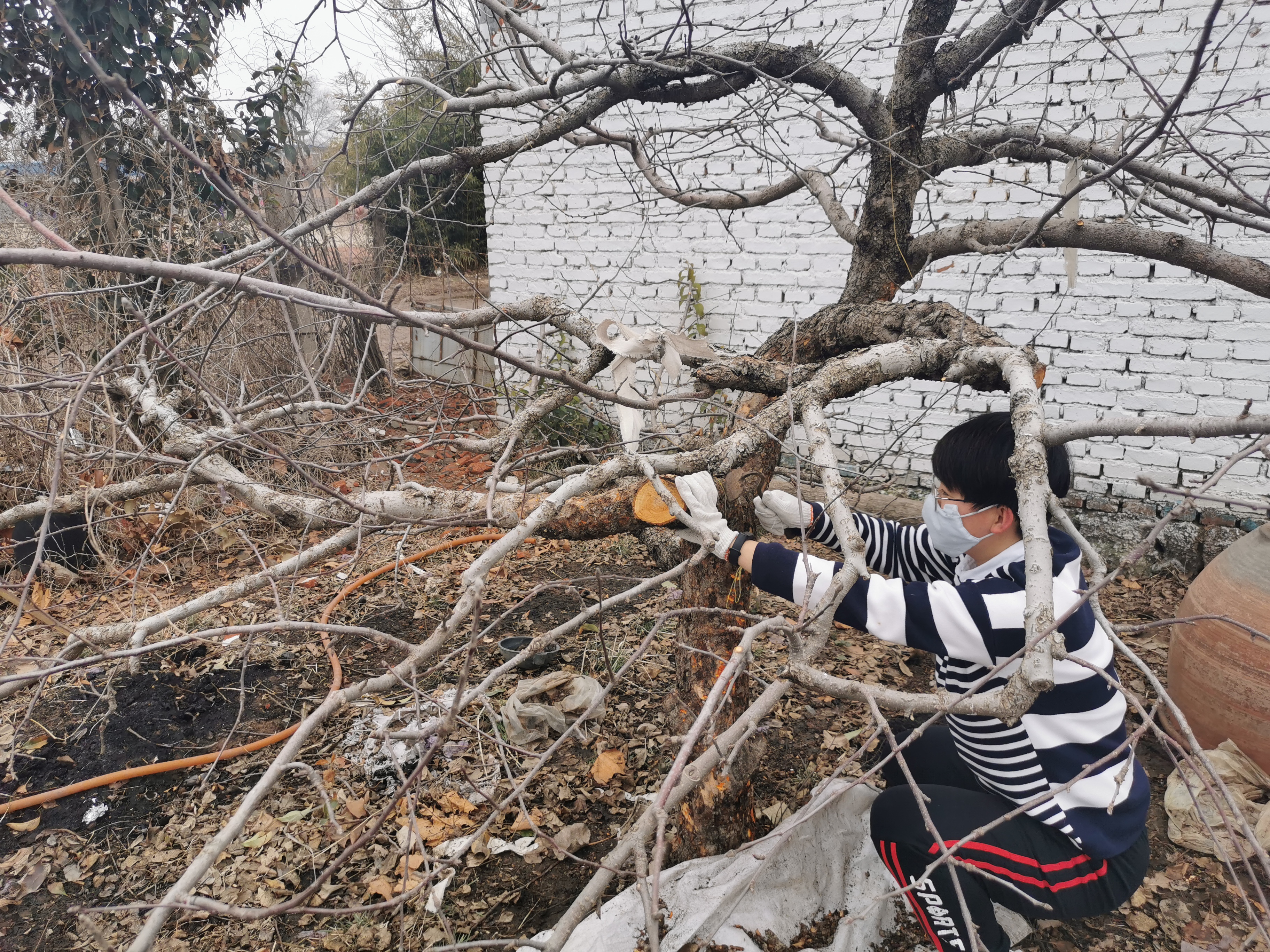 面对突如其来的疫情,各行各业都停工停产,但春耕不能耽误。作为大一新生的她,虽然专业知识不够丰富,但在果农的指导下开始了清理果树枝干的粗老翘皮的志愿活动。在她看来,产生助果农的想法很容易,但是坚持做到并做好却不是想象中的那样简单。在这里长大的她,清楚地知道这些老果树是果农一部分经济来源,对他们来说是很重要的,因此她深度参与,扎实帮扶村庄果农清理果园。在刮除病斑和粗皮的过程中,蹲着、弯腰等姿势总有酸痛感,偶尔还会被树枝刮到脸和手,但是每当她想到会消灭在老皮中越冬的大量螨类、病菌、虫卵,使衰弱树恢复生机,她便充满了干劲。同时韩文姣也查阅了许多相关资料、咨询学院专家教授,与果农的传统清理方式进行比较,发现工具和方法都需要改进。