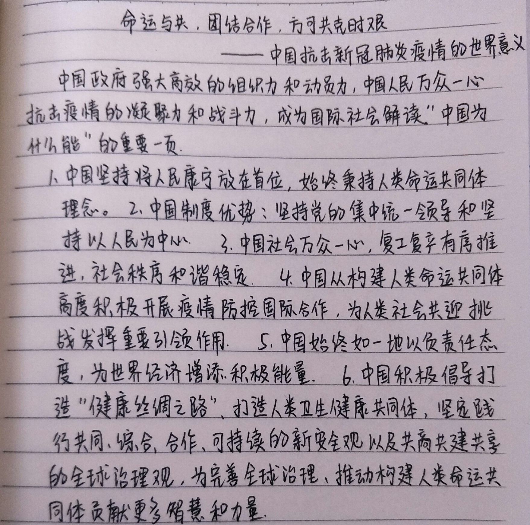 会上,各团支部主讲人通过“云端”与同学们对话,对当前疫情的最新情况做出说明,同时指出在新型冠状病毒前,中国抗击疫情的关键性作用及重大意义,并向同学们举例说明中国在疫情面前所体现出来的强大的组织力和动员力,以及中国人民万众一心抗击疫情的凝聚力和战斗力。学习中强调,中国始终坚持秉承人类命运共同体理念,以壮士断腕的决心和魄力,将人民的生命健康放在首位,直面危机,在防疫抗疫战争中做出贡献,为世界增添积极能量。政治学习期间,全体同学积极就“全球命运共同体”、“抗击疫情”等主题纷纷发言。并表示出对中国及全世界在抗击疫情必将取得最终胜利的坚定信心。