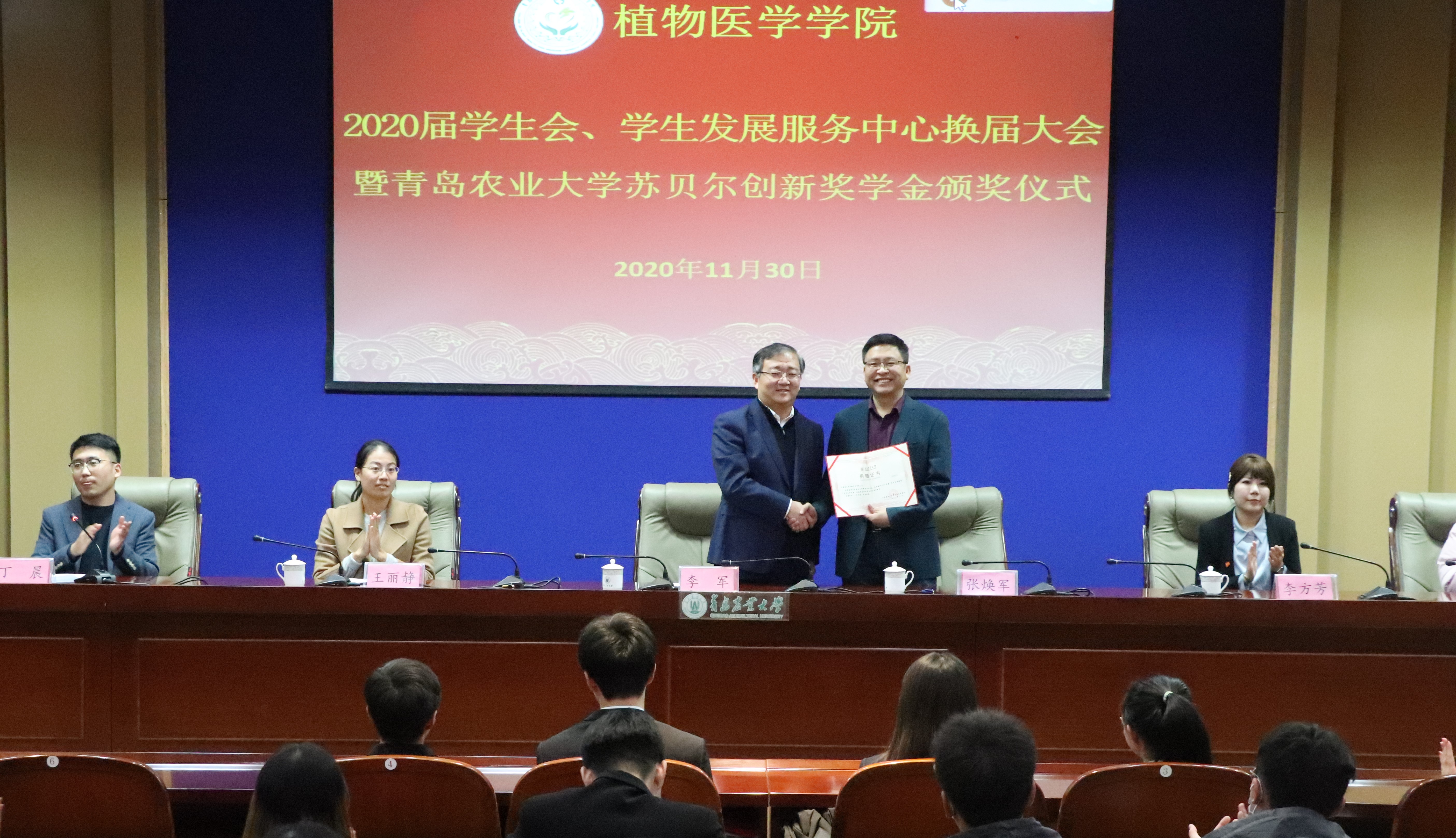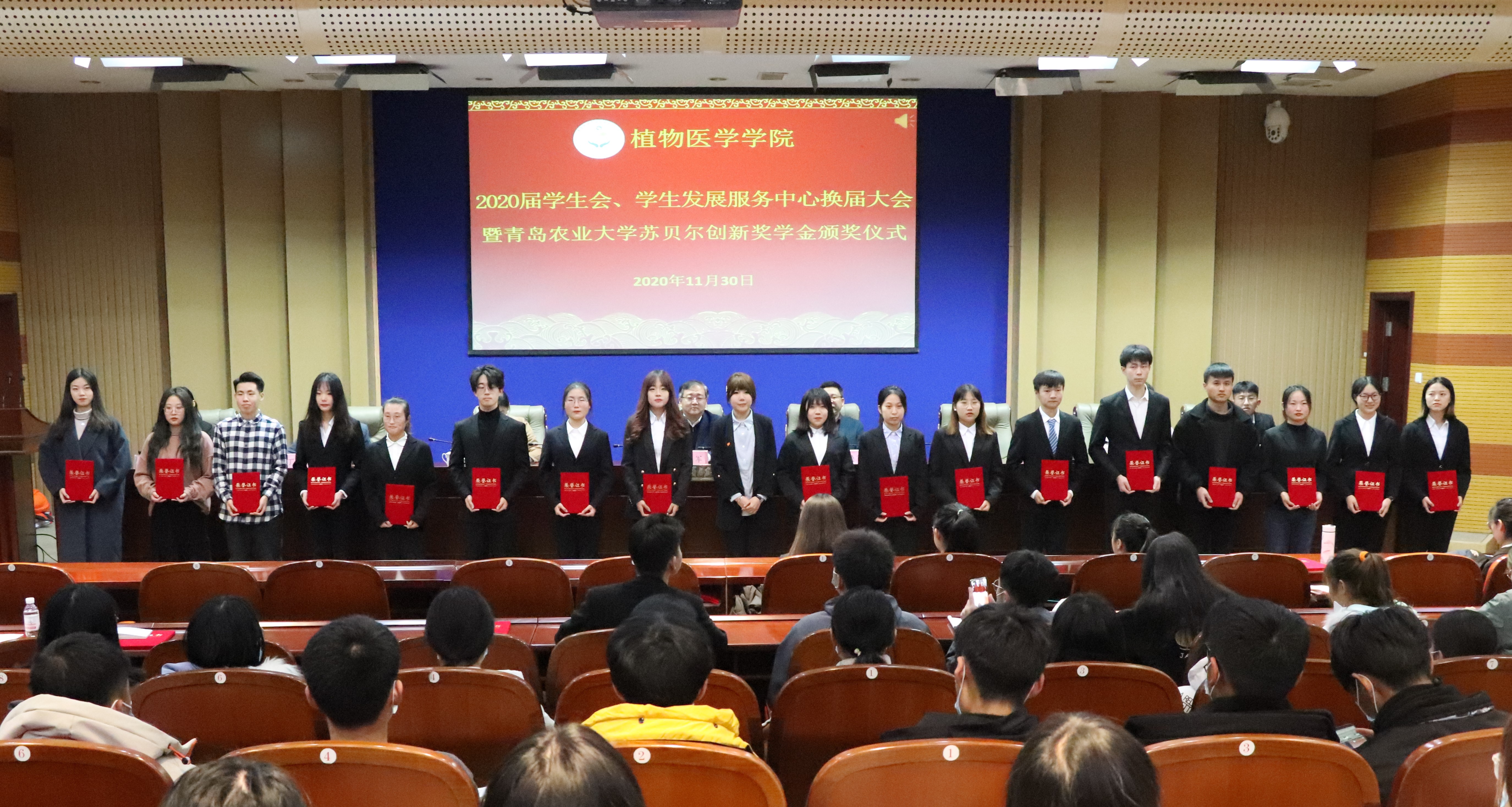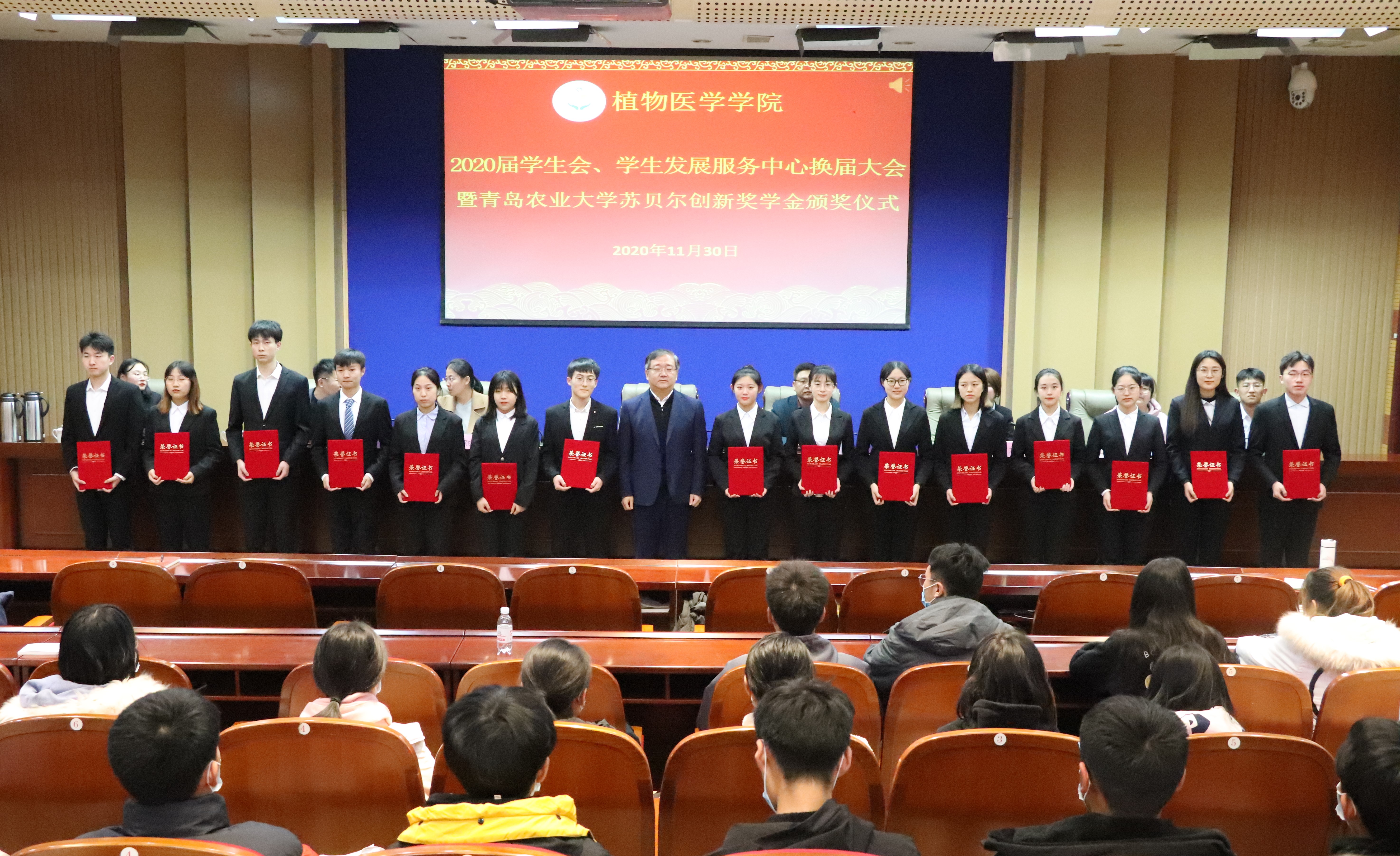 11月30日,tyc7111cc太阳成集团2020届学生会、学生发展服务中心成立大会暨苏贝尔创新奖学金颁奖仪式在学术会馆第一报告厅举行,苏贝尔作物营养有限公司副总经理张焕军、人事经理李方芳,tyc7111cc太阳成集团党总支副书记、副院长李军,团委书记王丽静,辅导员丁晨、姚延珠,兼职辅导员毛文玉、闫昊出席会议,2018级、2019级学生干部及2020级全体同学参加,会议由丁晨主持。