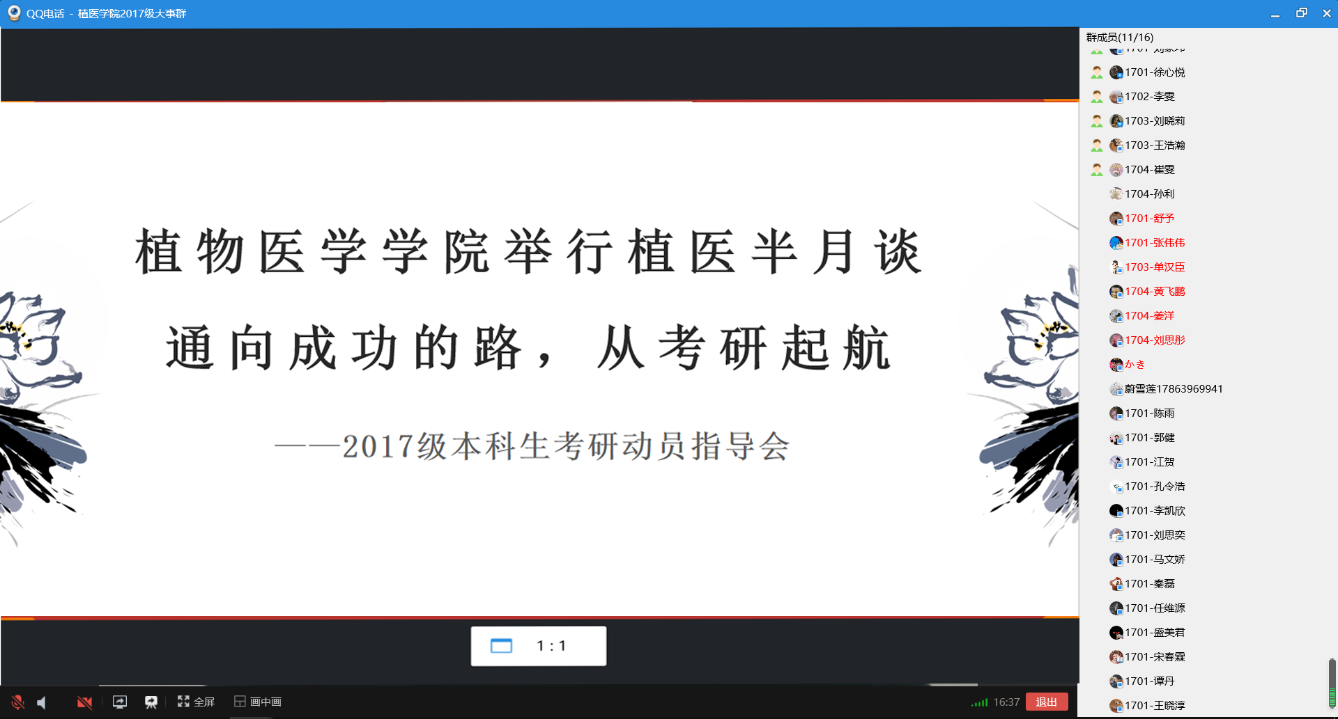 为切实做好2017级本科生的考研动员与指导工作,4月7日,tyc7111cc太阳成集团举行“植医半月谈”:通向成功的路,从考研起航——2017级本科生考研动员指导会。会议由学院党总支副书记、副院长李军通过QQ会议线上主讲,学院团委书记王丽静、辅导员丁晨出席本次会议,2017级全体学生参加。