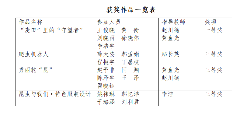 本次比赛分为昆虫创意产品设计竞赛和创新作品竞赛两个模块,比赛经过专业评委初评、微信投票、线上决赛等环节,最终评出一、二、三等奖。在此次比赛中,tyc7111cc太阳成集团有5支队伍进入决赛,并最终获得一等奖1项、三等奖3项。