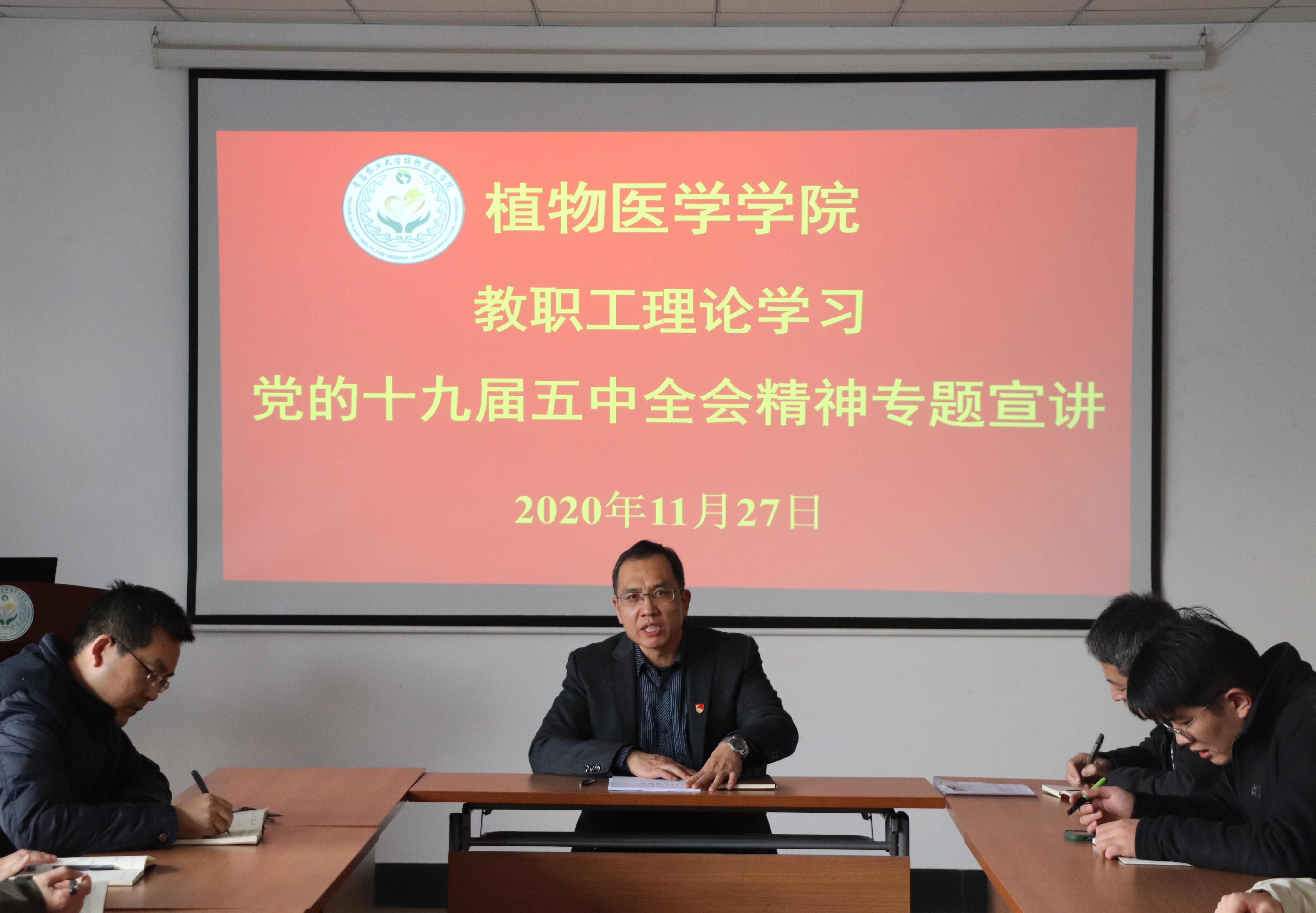 11月27日,tyc7111cc太阳成集团于学院会议室召开学习贯彻党的十九届五中全会精神专题宣讲。学院党总支书记韩强面向学院全体教职工作“书记第一讲”。