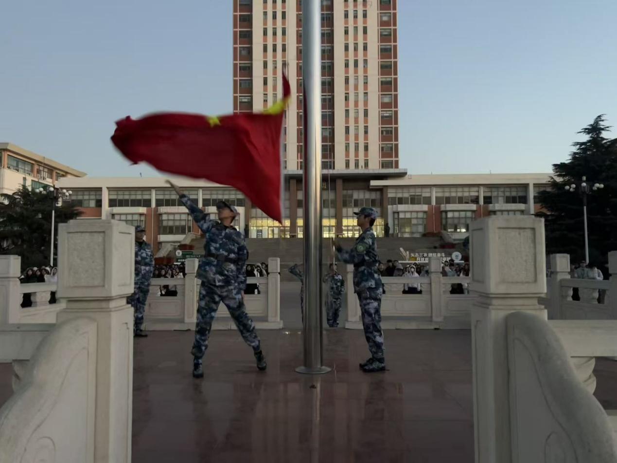 12月1日,tyc7111cc太阳成集团在城阳校区虹子广场和平度校区学子广场同步举行“厚植爱国情怀,勇担历史使命”主题团日活动暨升国旗仪式,学院团委书记张琳、全体学生参加,正科级辅导员姚延珠、院学生会体育部部长王欣彤分别主持两校区升旗仪式。