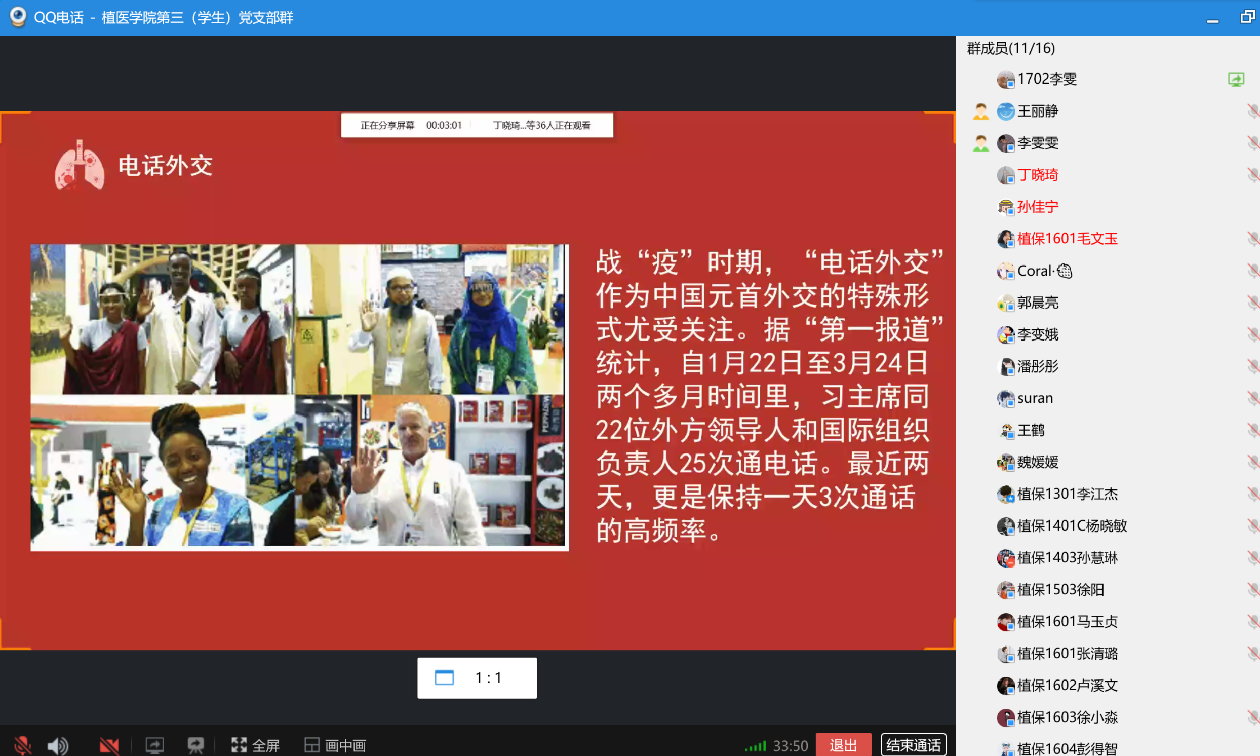 随后,学生党员李雯同志为大家讲述了这场国际战役的中国温度。疫情发生以来,中国始终秉持人类命运共同体理念,本着公开透明和负责任的态度及时发布疫情信息、分享经验、开展合作,中国政府已经宣布向82个国家和世界卫生组织、非盟提供援助,包括检测试剂、口罩、防护服等,其中多批援助物资已经送达受援方。全球战疫期间,习近平总书记频繁同外国元首、政府首脑以及国际和地区组织负责人交流,介绍中国经验、传递必胜信心。特别是疫情在全球多点暴发后,习近平总书记在外交辞令中经常用到“患难见真情”“阳光总在风雨后”“铁杆情谊”“感同身受”这样的暖心话语,表达中方的关心支持,传递同舟共济、携手抗疫的坚定信念。