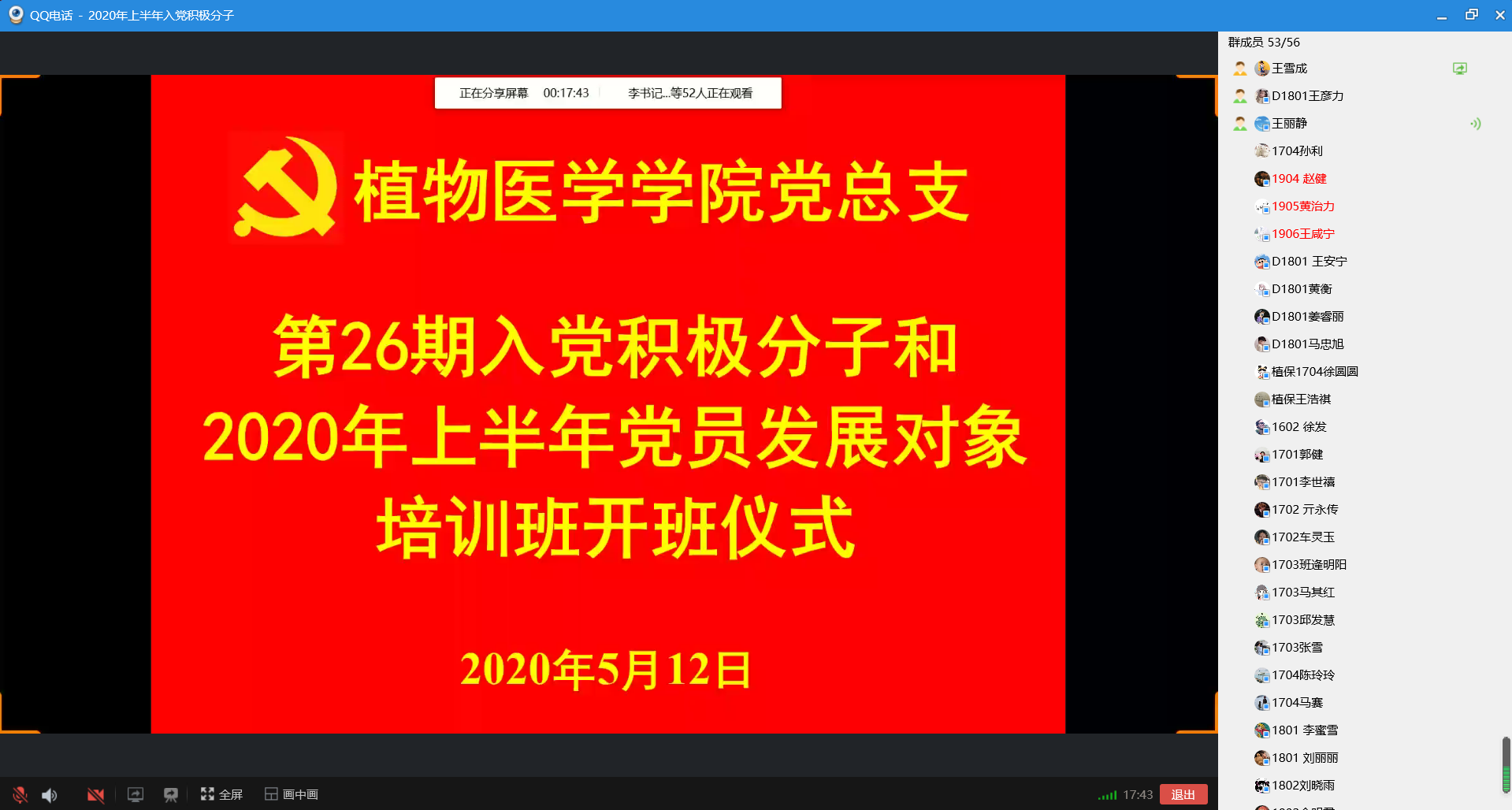 5月12日,tyc7111cc太阳成集团党总支举行第26期入党积极分子和2020年上半年党员发展对象培训班线上开班仪式,党总支副书记、副院长李军出席,第26期入党积极分子和2020年上半年党员发展对象共52名学员参加,开班仪式由学院团委书记王丽静主持。