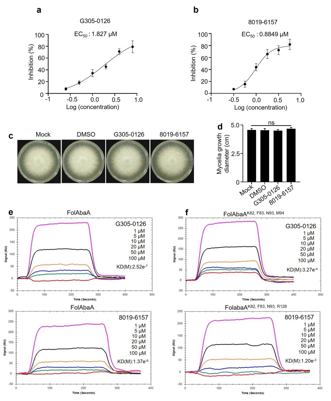 Fig. 1 Effects of G305-0126 and 8019-6157 on F. oxysporum f. sp. lycopersici (Fol) and their interactions with FolAbaA.