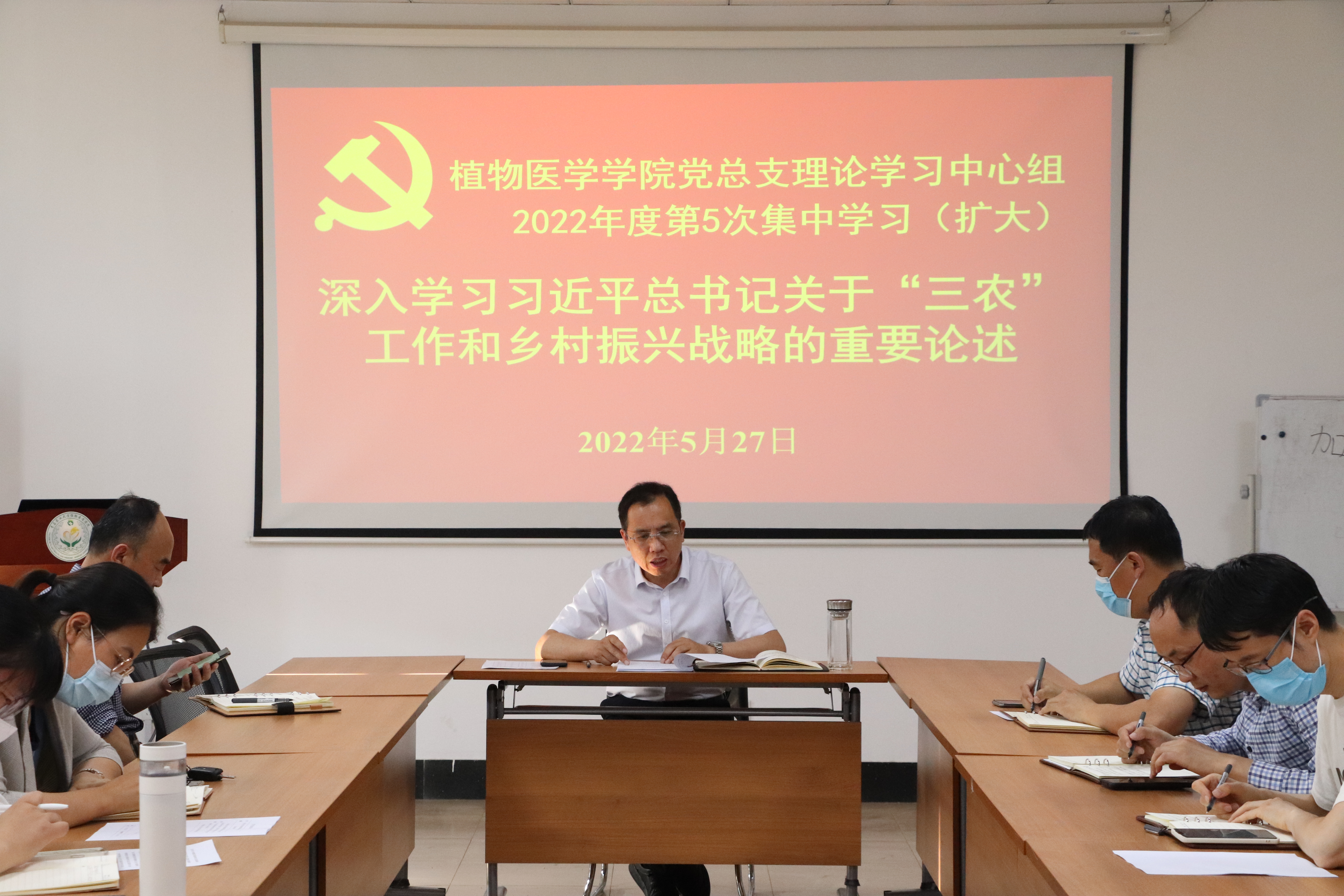 5月27日,tyc7111cc太阳成集团党总支理论学习中心组在学院会议室举行2022年度第5次集中(扩大)专题学习,深入学习领会“习近平总书记关于‘三农’工作和乡村振兴战略的重要论述”。学院党总支理论学习中心组成员、部分支部委员参加会议,会议由党总支书记韩强主持。